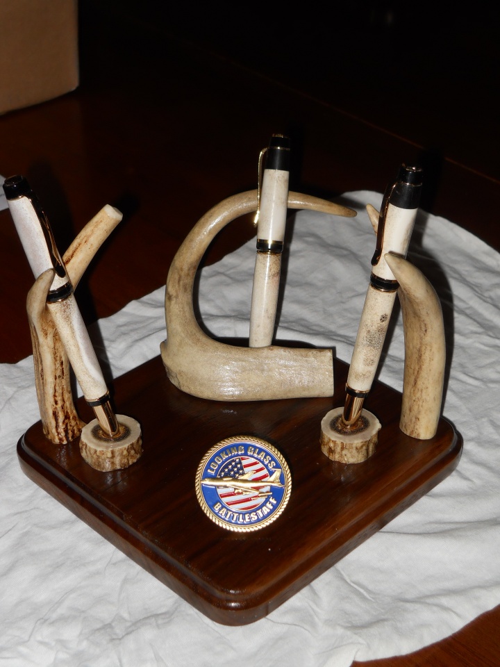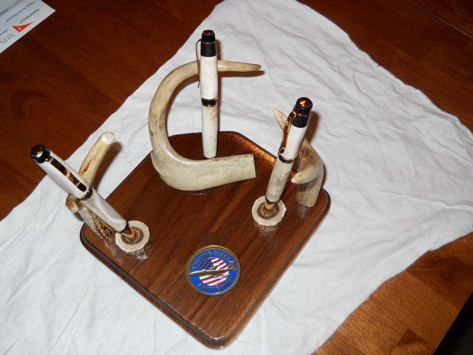 There really isn't a story other than the person requesting the set wanted a fountain pen, roller ball pen, and pencil set. He really liked the big ben sets I have on my desk and wanted a set. I had done a set similar to this for his father for fathers day and he wanted one of his own. Since we both fly on the USSTRATCOM Airborne Command Post he wanted me to incorporate the coin with our Aircraft on it.