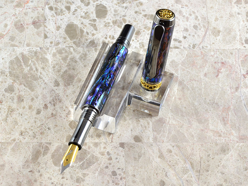 An Anthony Jr. kit in black titanium and gold on a Ron Robbins Paua Abalone blank (this is the natural color flavor), both from Exotic Blanks. I opted for the Heritance #6 nib upgrade which is a really nice writer. Much, much nicer than I expected from a steel nib.