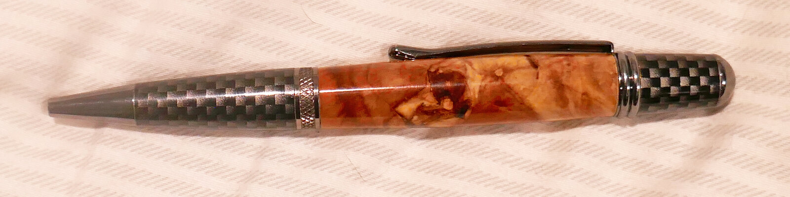 My son-in-law brought me a piece from a dead apple tree he had planted as a teenager. He asked if I could find anything in it for a pen. Two things, one I was very happy with the color from a piece that had three limbs coming out of one area. Second, I was surprised how hard Apple wood is. I looked up the Janka hardness – it is 1730 lb. compared to Red Oak which is 1,290 lb. Keep learning something new for me.
