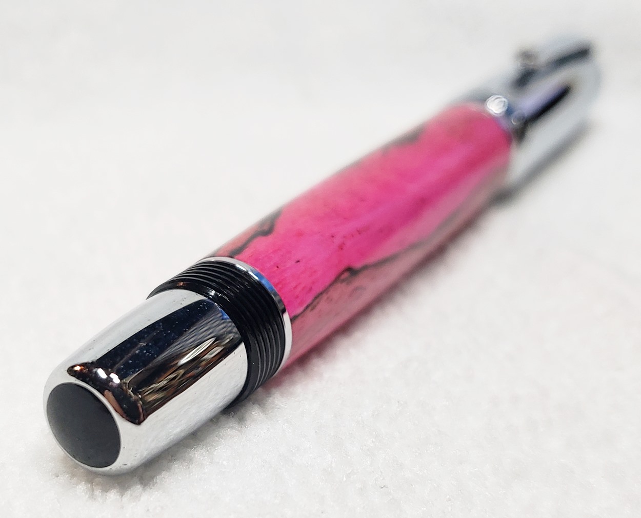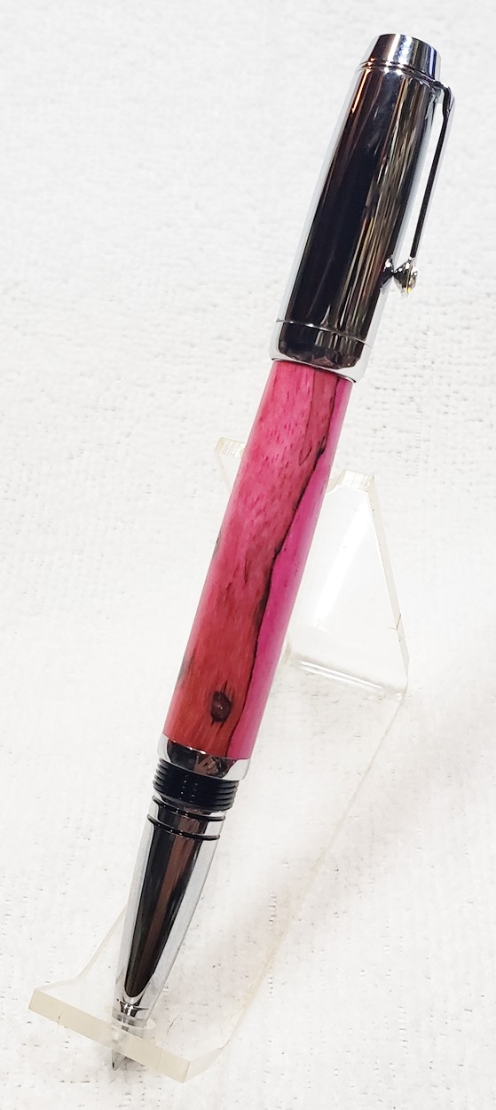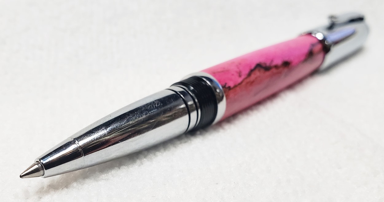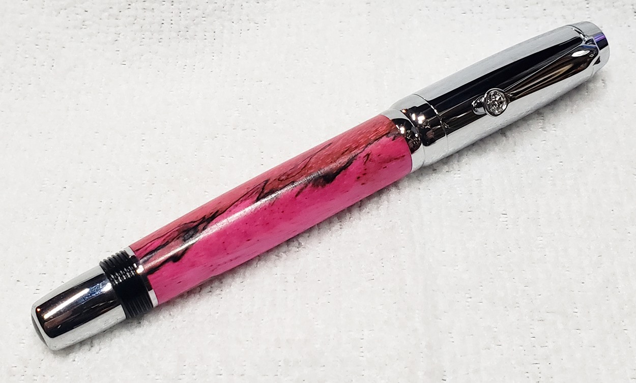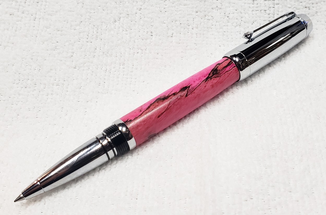 An Arete rollerball from Woodcraft. The blank is a stabilized dyed spalted tamarind in pink, also from Woodcraft. Finished with Pens Plus. This will be auctioned off at work, with all of the proceeds donated to the Susan G. Komen organization, in the name of one of the ladies who passed away from breast cancer last year.