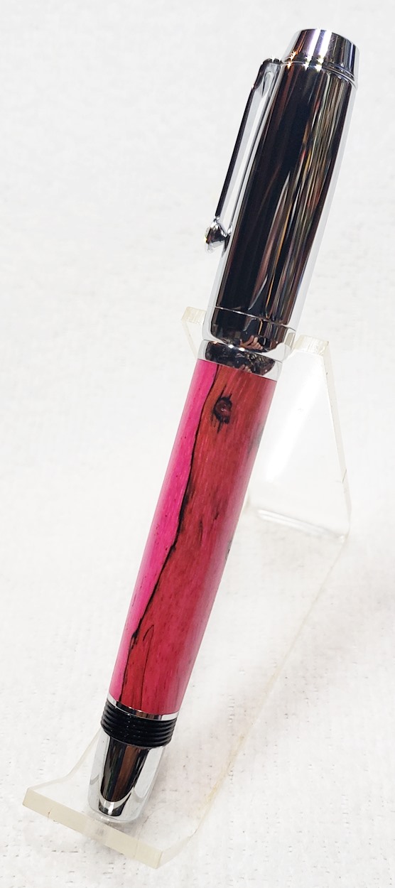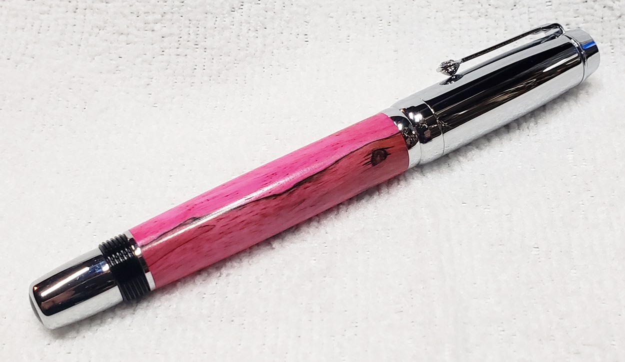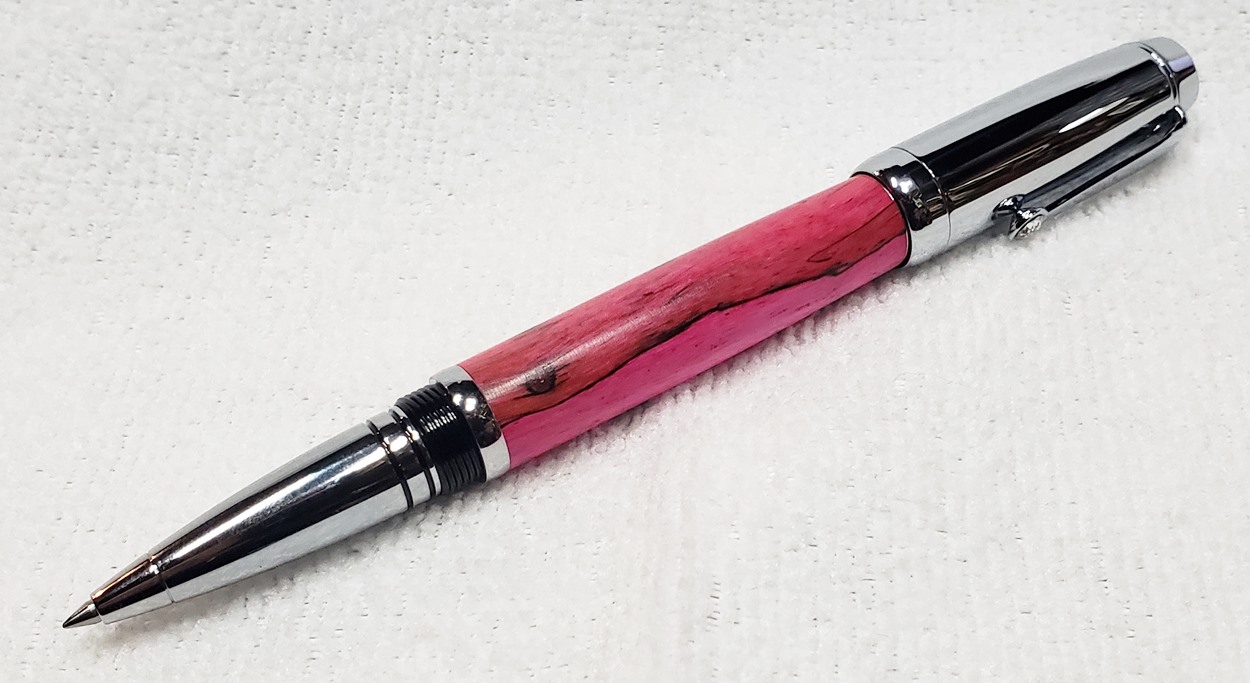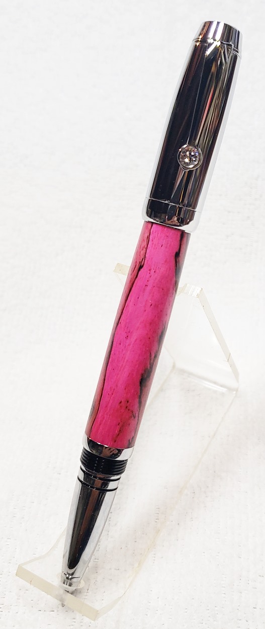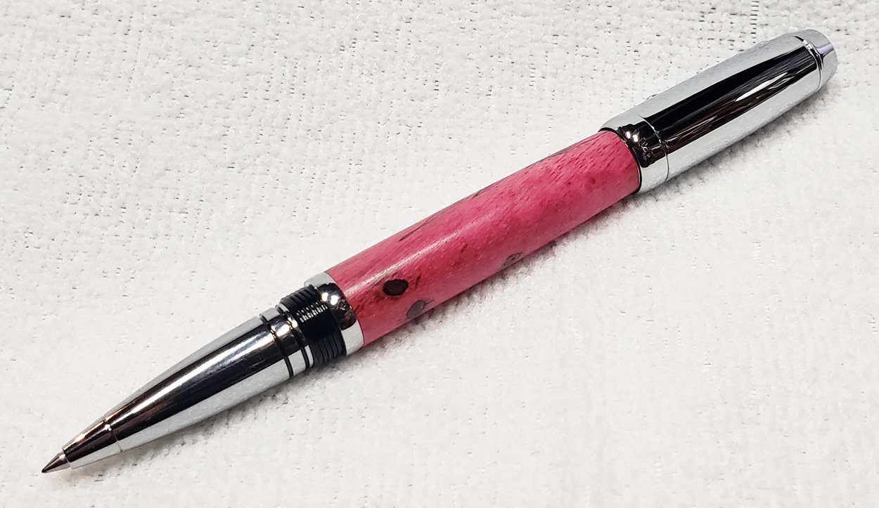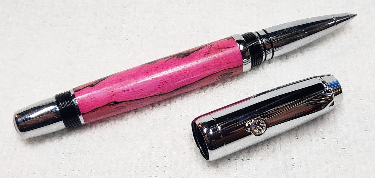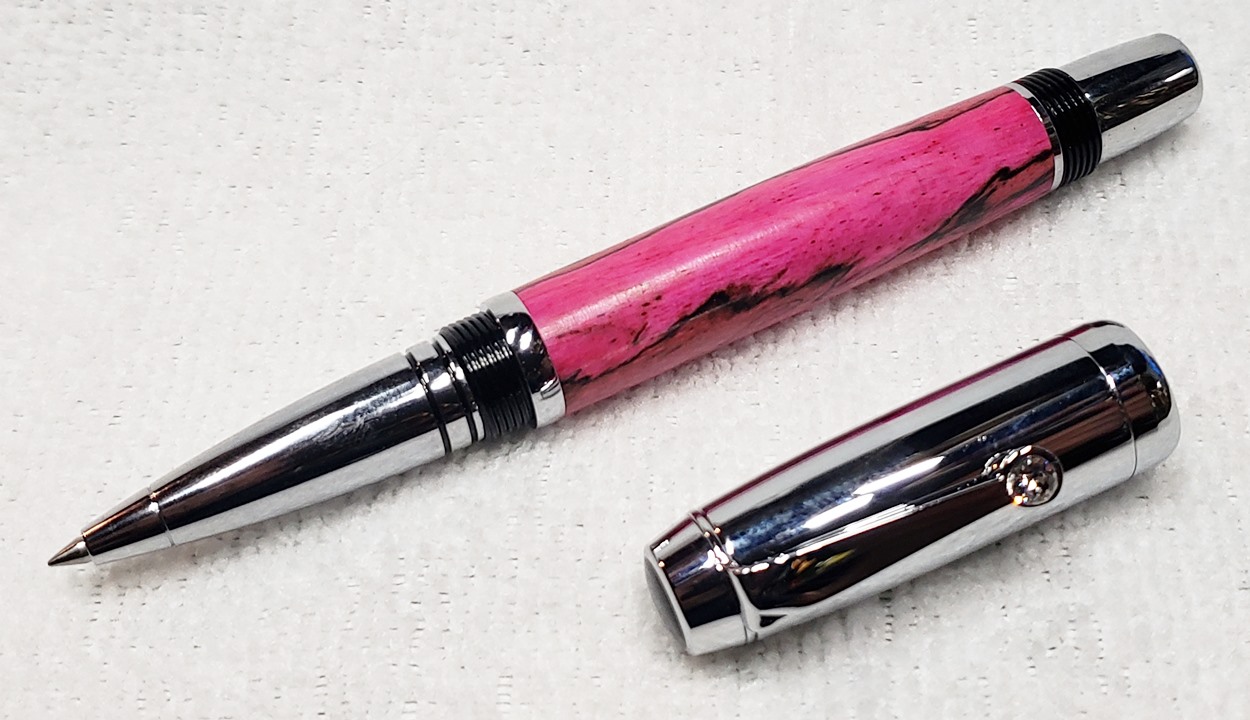 An Arete rollerball from Woodcraft. The blank is a stabilized dyed spalted tamarind in pink, also from Woodcraft. Finished with Pens Plus. This will be auctioned off at work, with all of the proceeds donated to the Susan G. Komen organization, in the name of one of the ladies who passed away from breast cancer last year.