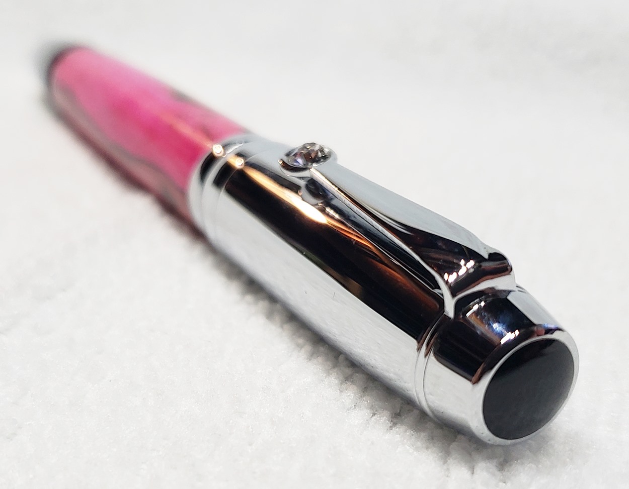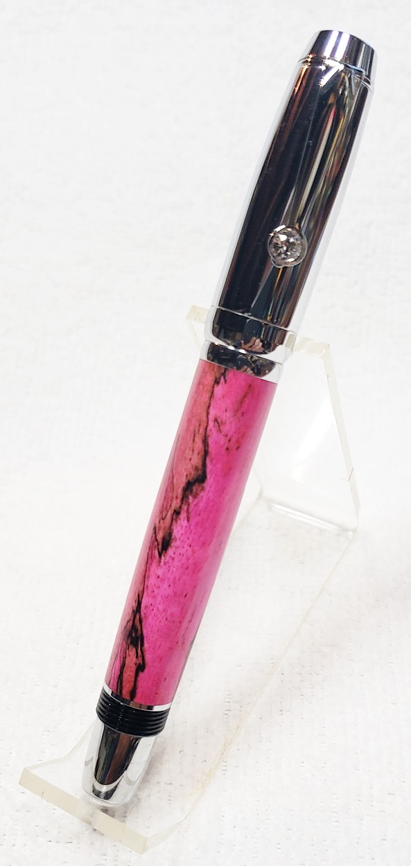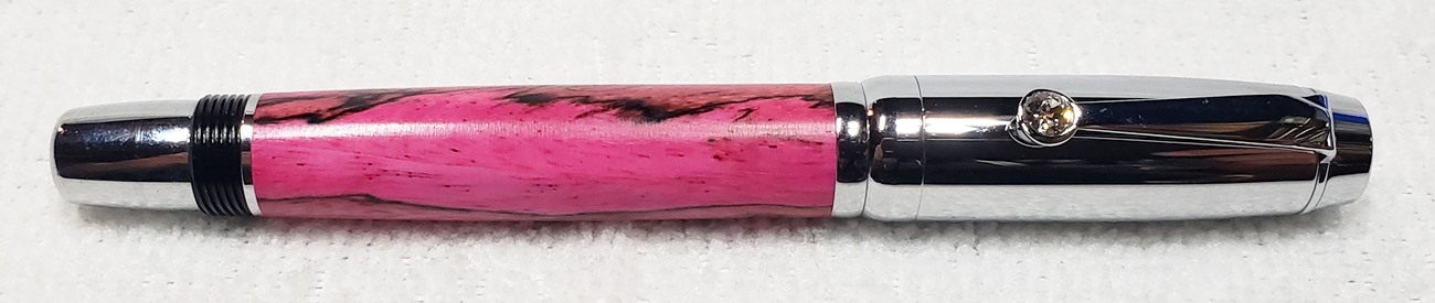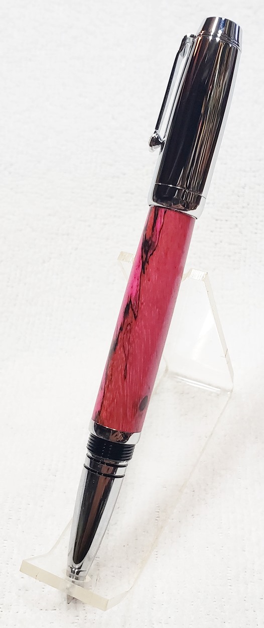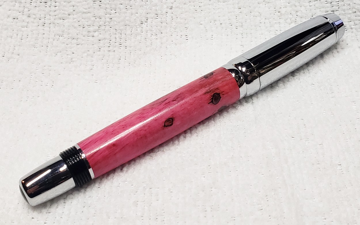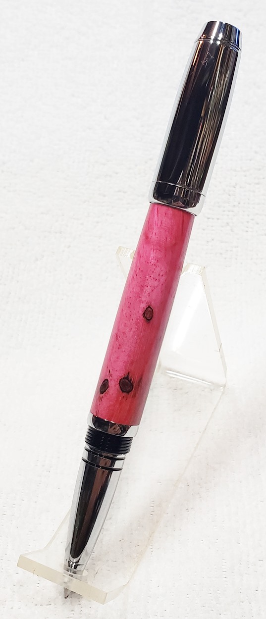 An Arete rollerball from Woodcraft. The blank is a stabilized dyed spalted tamarind in pink, also from Woodcraft. Finished with Pens Plus. This will be auctioned off at work, with all of the proceeds donated to the Susan G. Komen organization, in the name of one of the ladies who passed away from breast cancer last year.