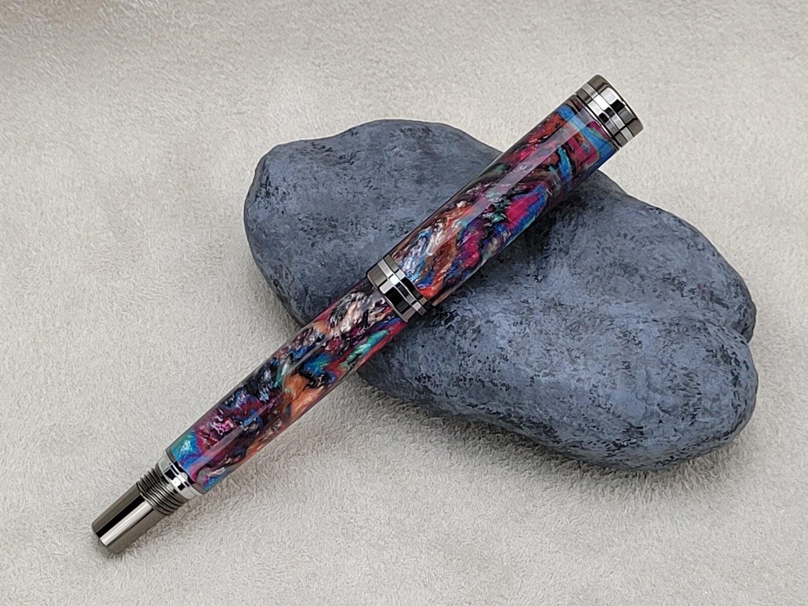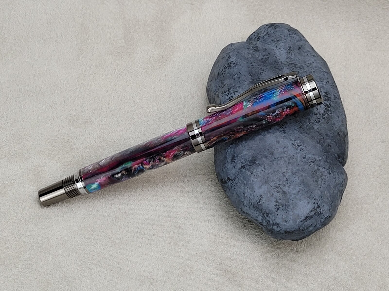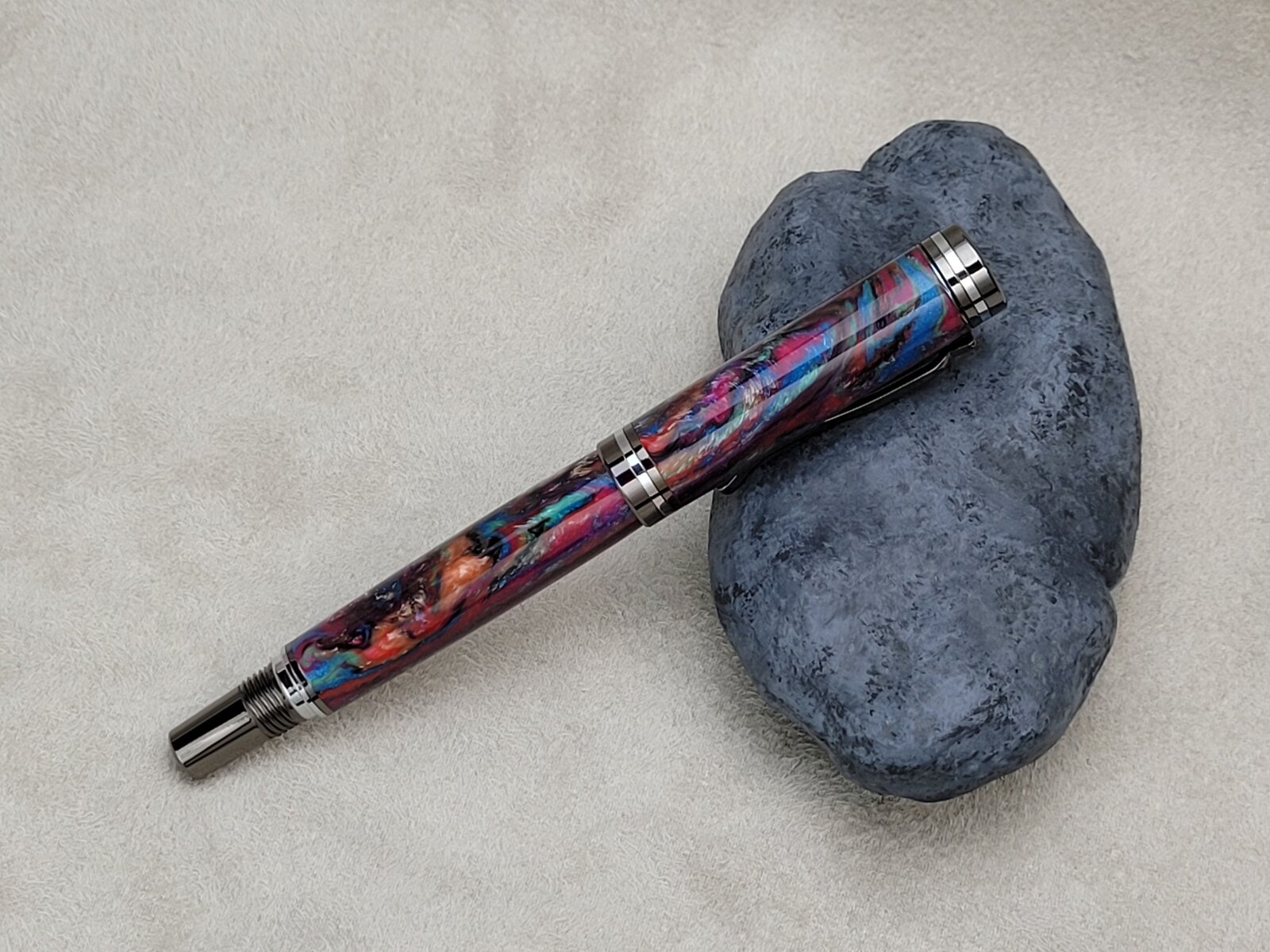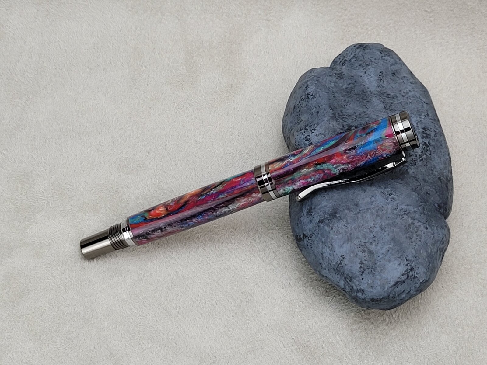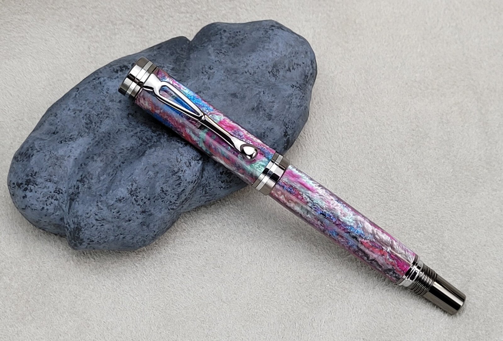 This is the first Atracia I have made, in gunmetal with chrome accents. It's a nice kit, and I like that the clip has a little different style. My only complaint would be that the clip ring is narrow and it makes the cap look like the finial is not pressed completely in. This is another blank from Axe and Iron on Etsy and the chatoyancy is... just wow. I think it was throwing off the focus a bit. Each side looks a little different, almost not like the same pen. I bought 6 of these blanks in different colors, so there's still 4 to go. This is finished with 2 coats of GluBoost med, and 2 thin, then polished with Zona and finished with Meguiar's. I find that CA gives Alumilite more visual depth.