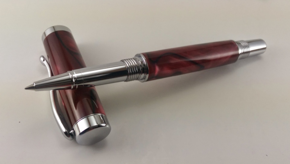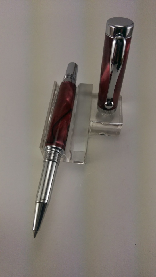Atrax chrome (with postable conversion) on red venetian. I really like the pearlescent swirl in this blank. Seems to change in depth as you move the pen in the light. First pen turned between centers. Def prefer over the mandrel. C&C welcome.