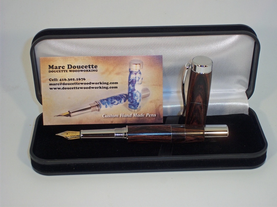 a chrome atrax in cocobolo, wax finish. 2 aluminum bands in the base and one in the cap. the cap one is a 'V' shape. not sure what to call it but it turned out great. definitely playing around with that some more. this is also the first time I rounded a blank before drilling it. I like that too.