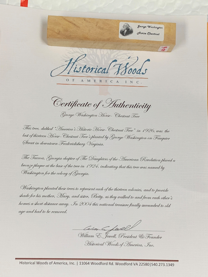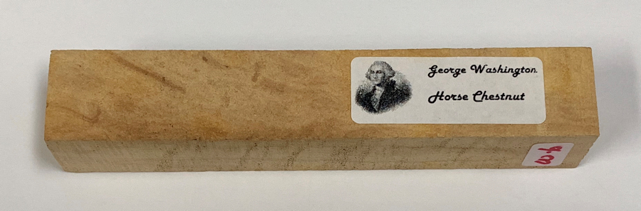 Through the generosity of [profile]Edgar[/profile], we have up for auction a George Washington Horse Chestnut blank. This historical piece of wood is from the last of 13 trees George Washington planted in Fredericksburg, Virginia, to represent the original 13 colonies of the United States. The tree was removed in 2004, and for a time the wood was made available by Historical Woods of America. They no longer offer the wood, only finished goods (including $400 pens!)