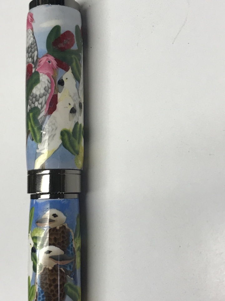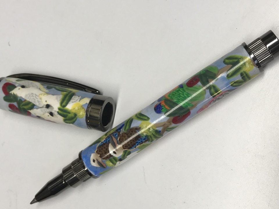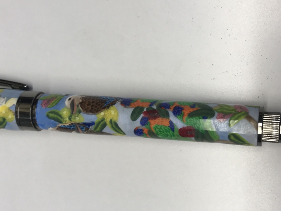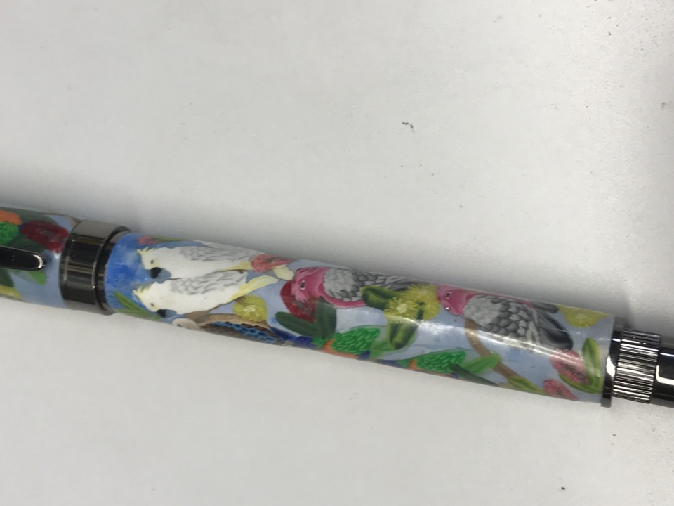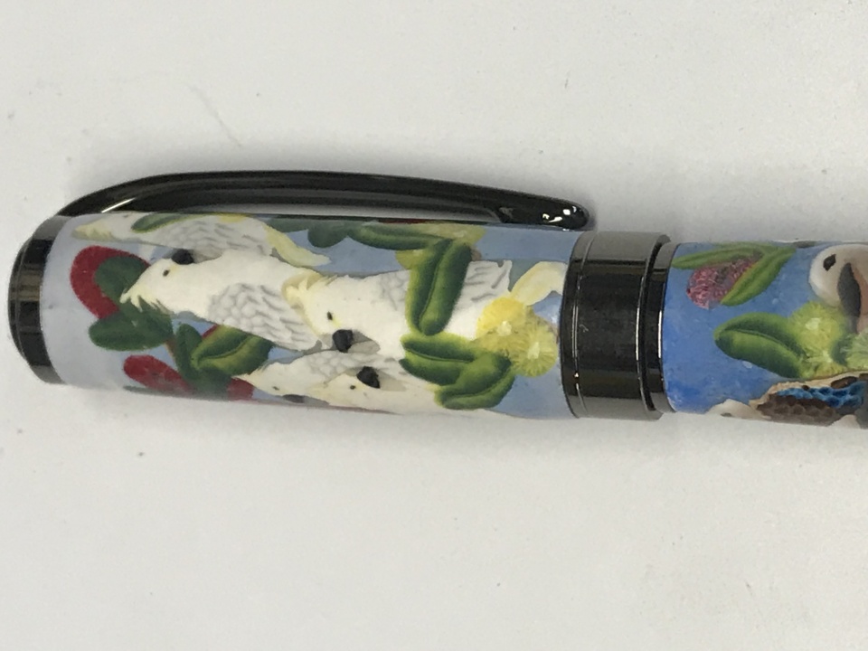 finished this one a Graduate Gun metal finish a special request on Australian Birds ( polymer clay, Rainbow parrots, Galah , Kookaburra and Cockatoo )this pen will go to complete my personal collection, blanks as been made by Anna Catharina Lentz here Downunder