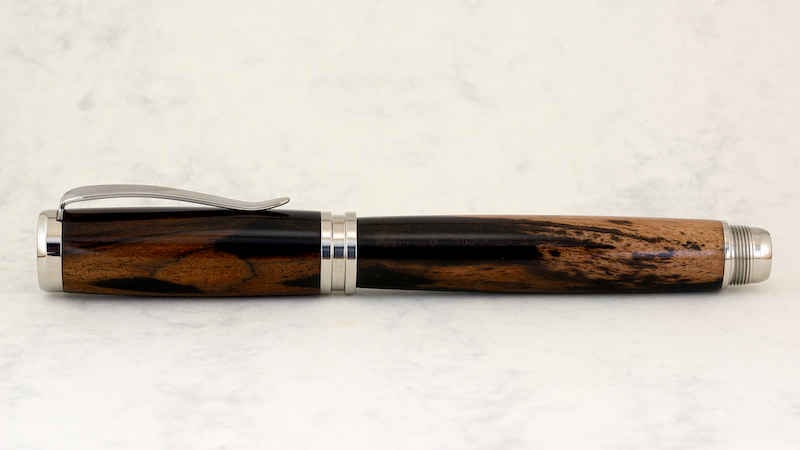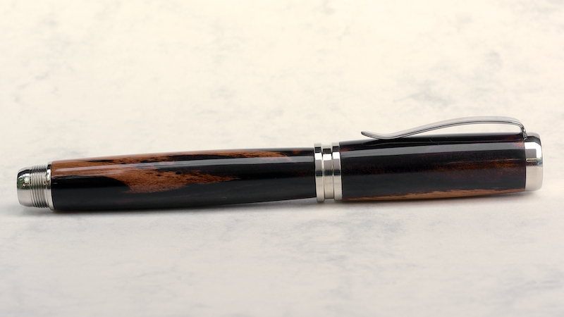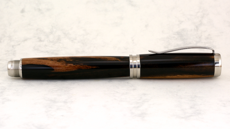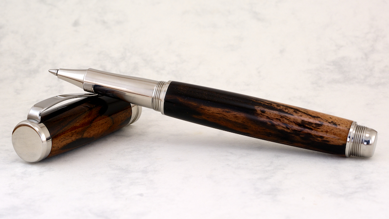 A 2-tone piece of Australian Ebony (Dyospyros humilis) on a Stainless steel Eagle Rollerball. It has a CA finish.