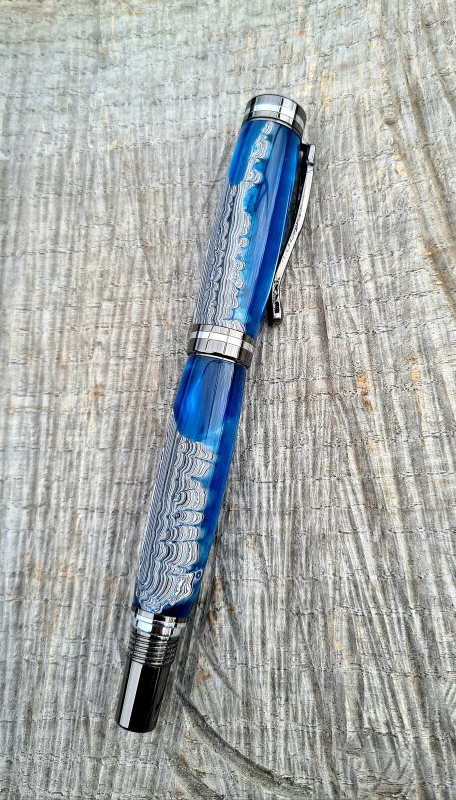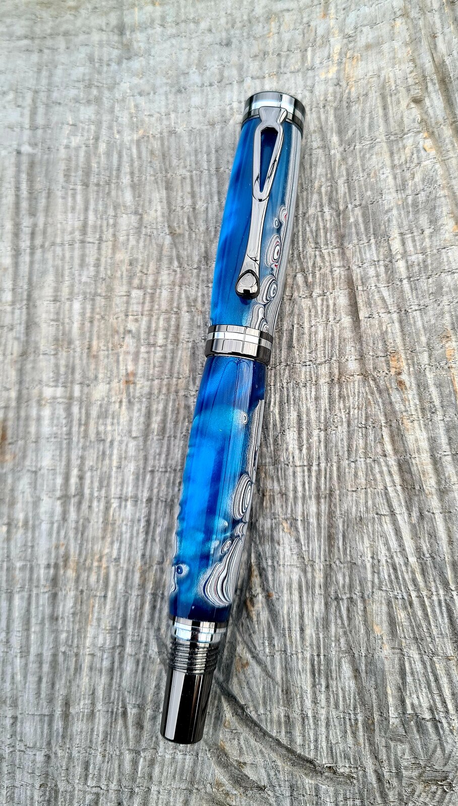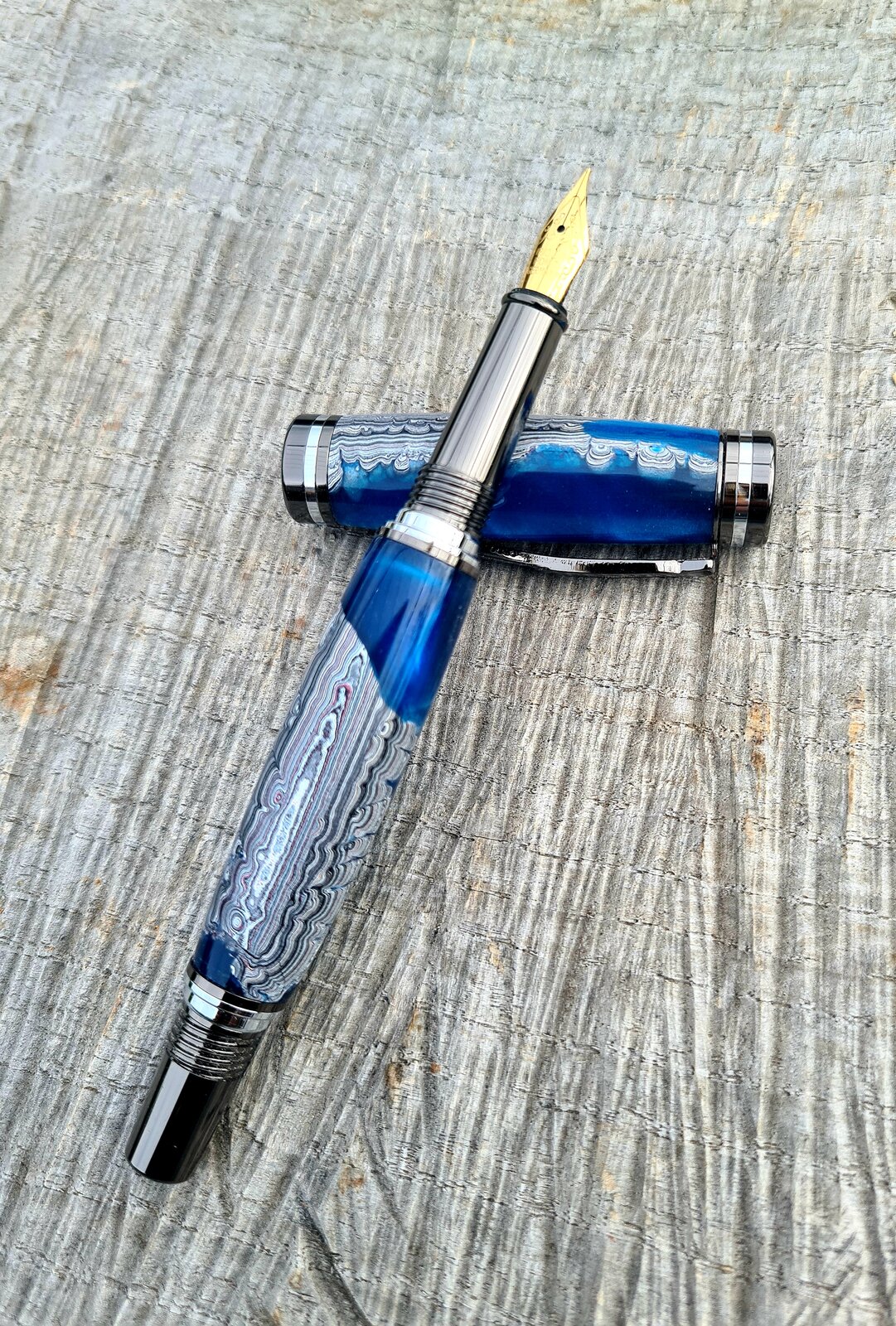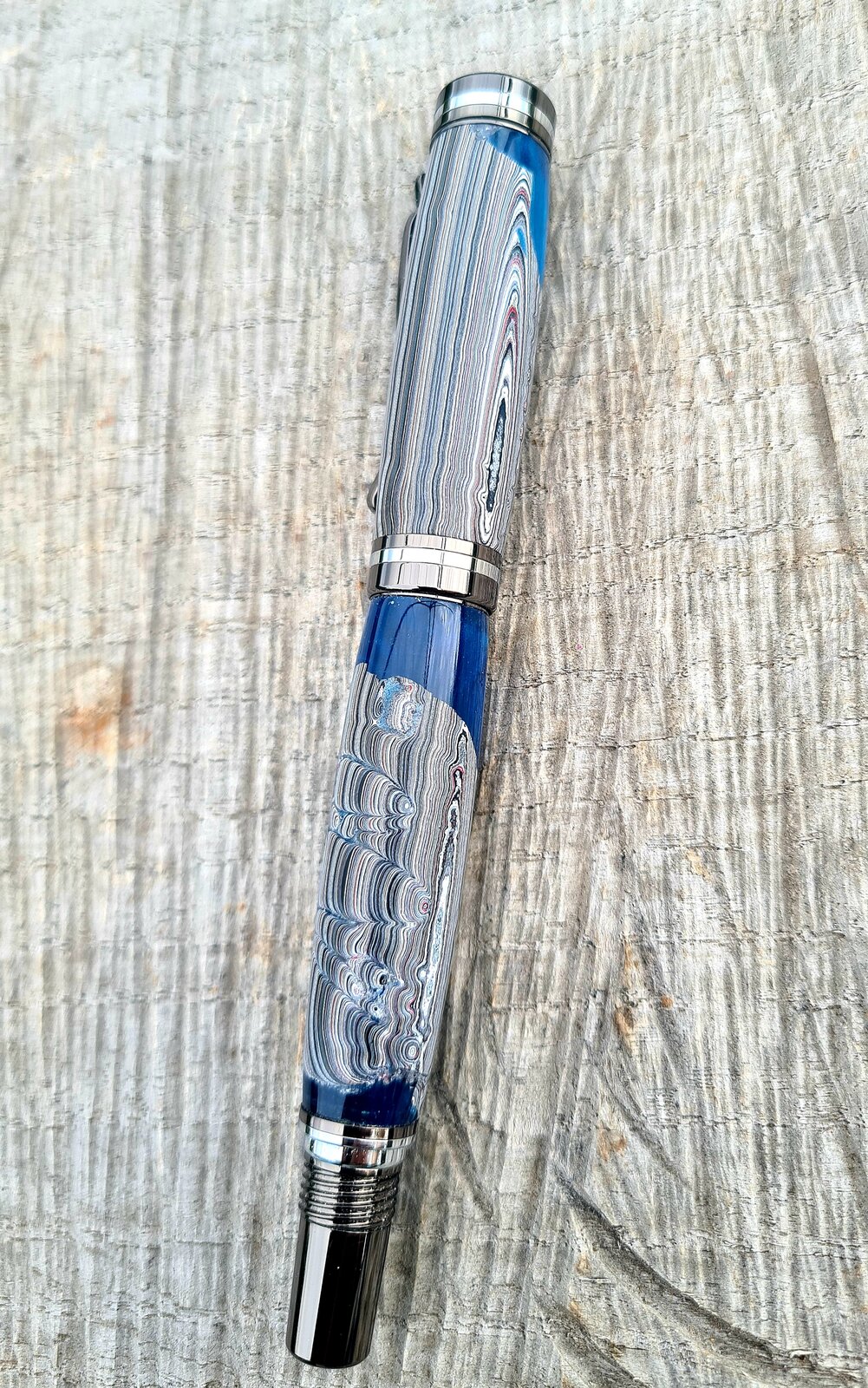 Recently I was given a few chunks of 'fordite' I suppose you could call it. It is the accumulated over spray of paint on the racks of my friend's automotive shop. 10 years worth! Some small pieces were cast in resin by my good friend Sam Baker from Steve's Woodcraft here in Australia. She did a fantastic job! Kit is a berea atracia fountain pen. Thanks for looking!