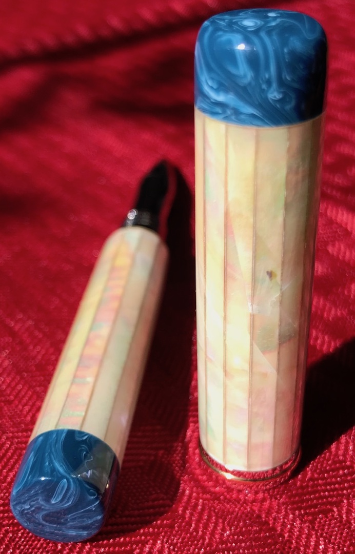 The pen shimmers in the light, although I'm unable to catch the effect with my smartphone. Made for my wife's bday, hopefully she will like it. Having constructed only kit pens, this was a fun exercise, and a small step towards making a fully kit-less pen.