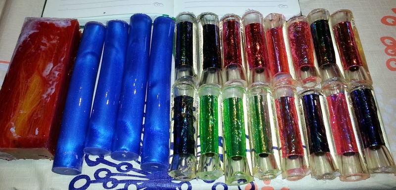 2) First try at a solid color blank with the West Systems Resin. 6" True Blue PearlEx. The heat made the casting tubes deform a bit so they aren't perfectly straight, but at 1" who cares.