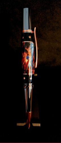 The blank on this Black Ti and Copper Aero Twist is an Exotic Blank's "Electric Nebula Alumilite". The twelve copper pins were made from solid core wire and glued into the blank with thin CA glue after the holes were carefully located using the lathe's indexing wheel and drilled to the surface of the brass tube using the depth stop on my drill press. The four larger pins were made from 3/32" copper tubing filled with epoxy mixed with "True Blue" and "Macro Pearl" Pearl Ex powder pigments. The copper inlay was made from a 0.25" thick copper sheet. The blank with pins and inlay was turned with a carbide cutter and then finished using Micromesh pads to 12000 grit and polished with Meguiar's Plastx.