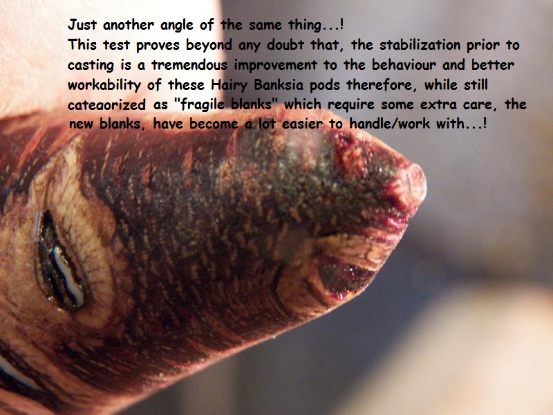 My decision to do these blanks with the stabilised pods, is due to the constant complains from those that ignored any of my advice on how to handle these blanks and decided to treat them as if they were solid wood blanks, and then complain that the blanks are no good and are not made right so, I need to make sure, these blanks if made are going to be made with the best options I have to make them a little more user friendly, we all know and saw, what these blanks can do when done right, the stabilisation is not going to solve all the problems but will improve their workability up to 50%, that is the best I can do at the moment, with the materials I have available to use.