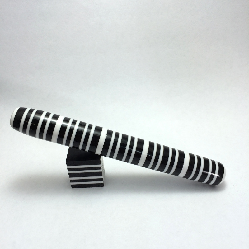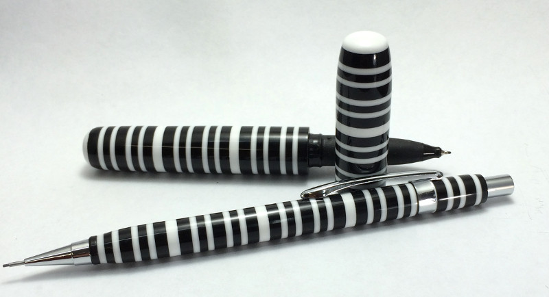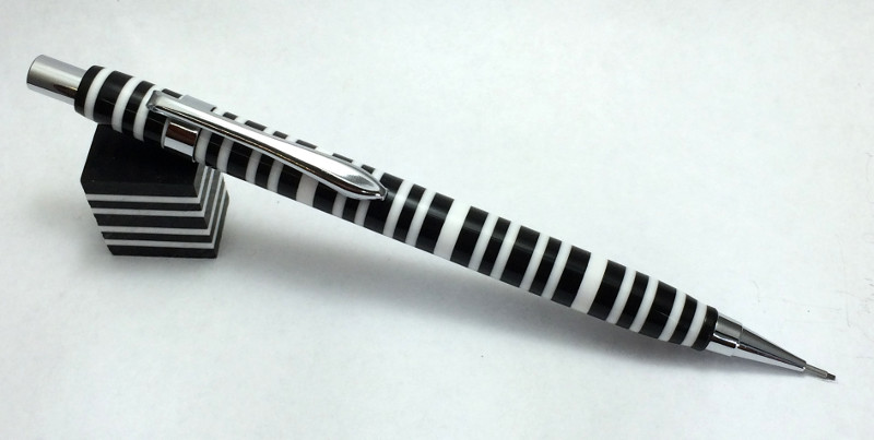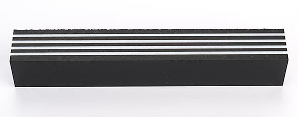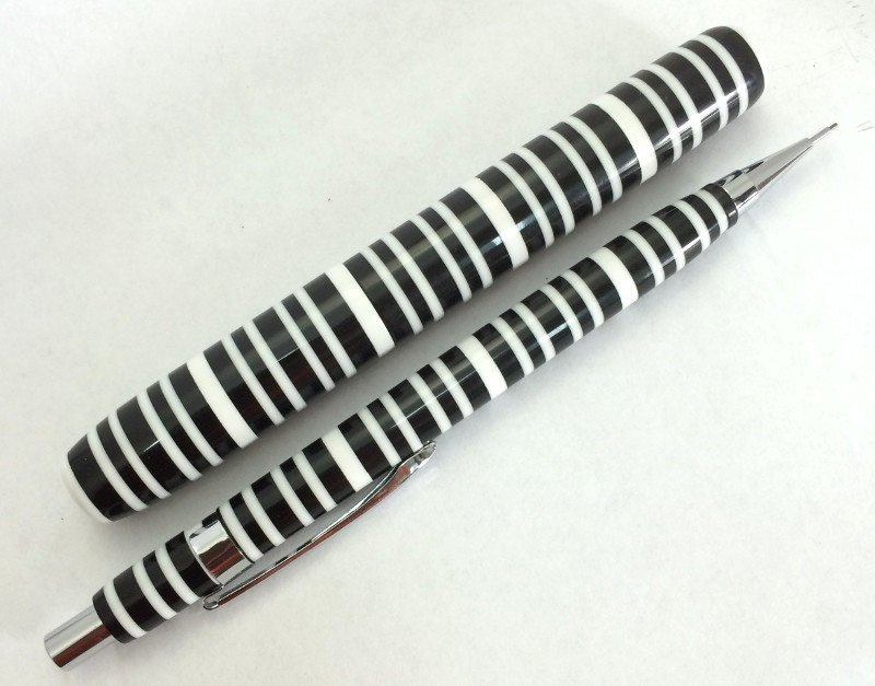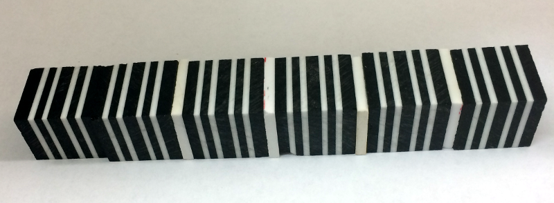 Cut five cubes out of each blank rotated the cubes ninety degrees and used CA to glue them back together with a 1/8 inch white Corian segment between each cube. The result looked something like this: