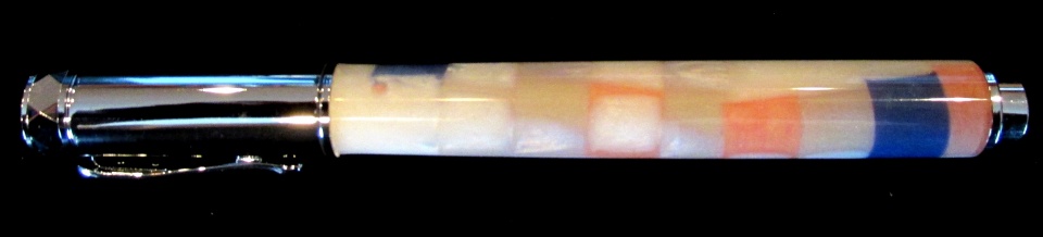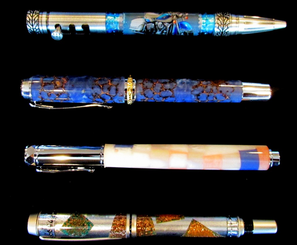 1st one is the Harley on the Gear kit, 2nd one on a Jr. Statesmen is a mystery and I told him not to tell me what it was yet - any guesses? - but in person the blue really pops, the 3rd one is bits of colored acrylics embedded in a white casting on a Zen that has real calming appearance and the 4th one is a hammered foil on a Navigator.