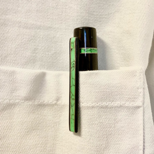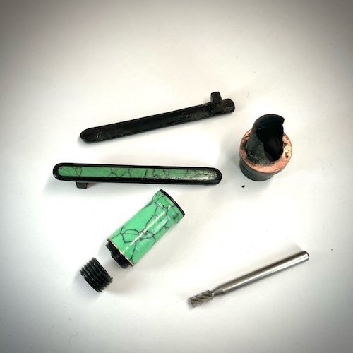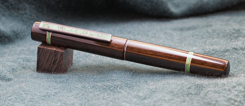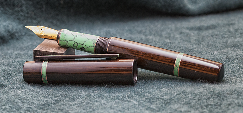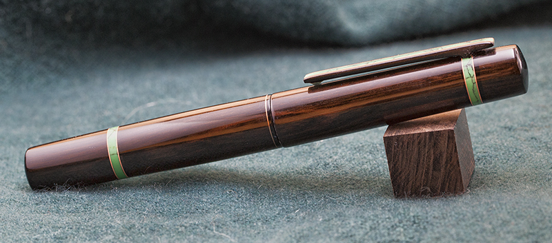 For this fountain pen, I used some ebony for the body and cap (I thought it was Indian ebony but looking at the color it might be mun ebony), ebonite for the threaded bits. trustone variscite for the section and inserts, and 32 gauge copper for the various inlays. The parts I didn't make are the nib triplet (Jowo#6 gold plated). The finish is Gluboost CA. The threads are M13x0.8 triple start for the cap/body and M10x1 for the body/section.