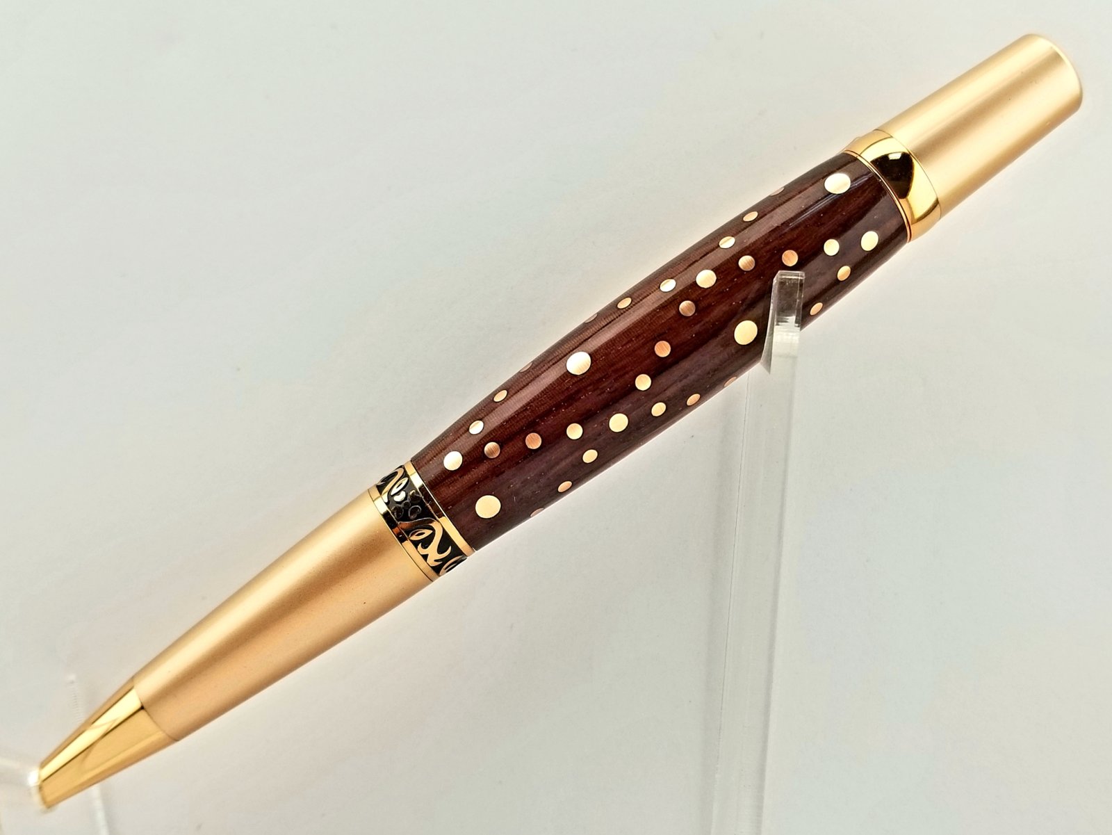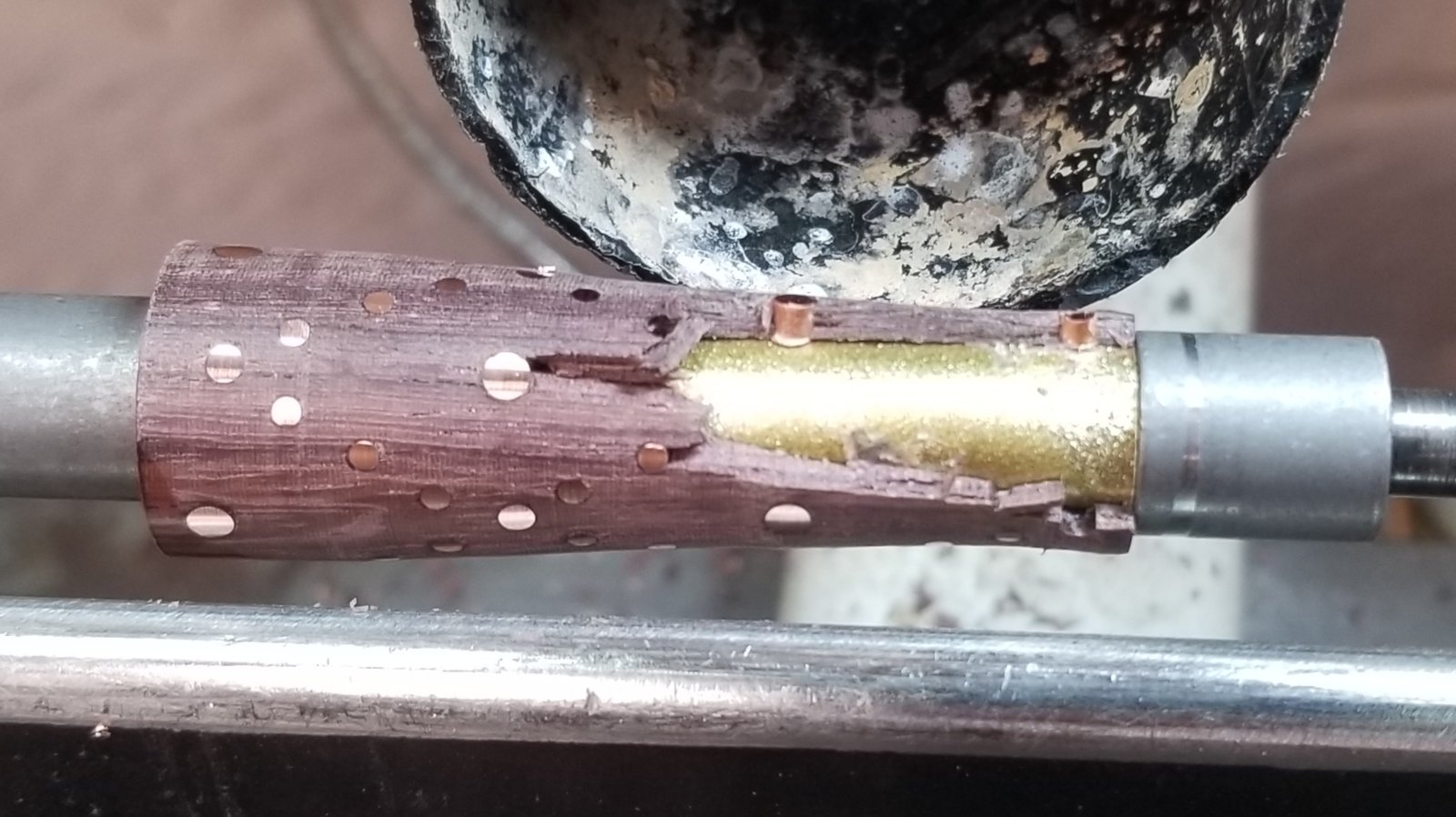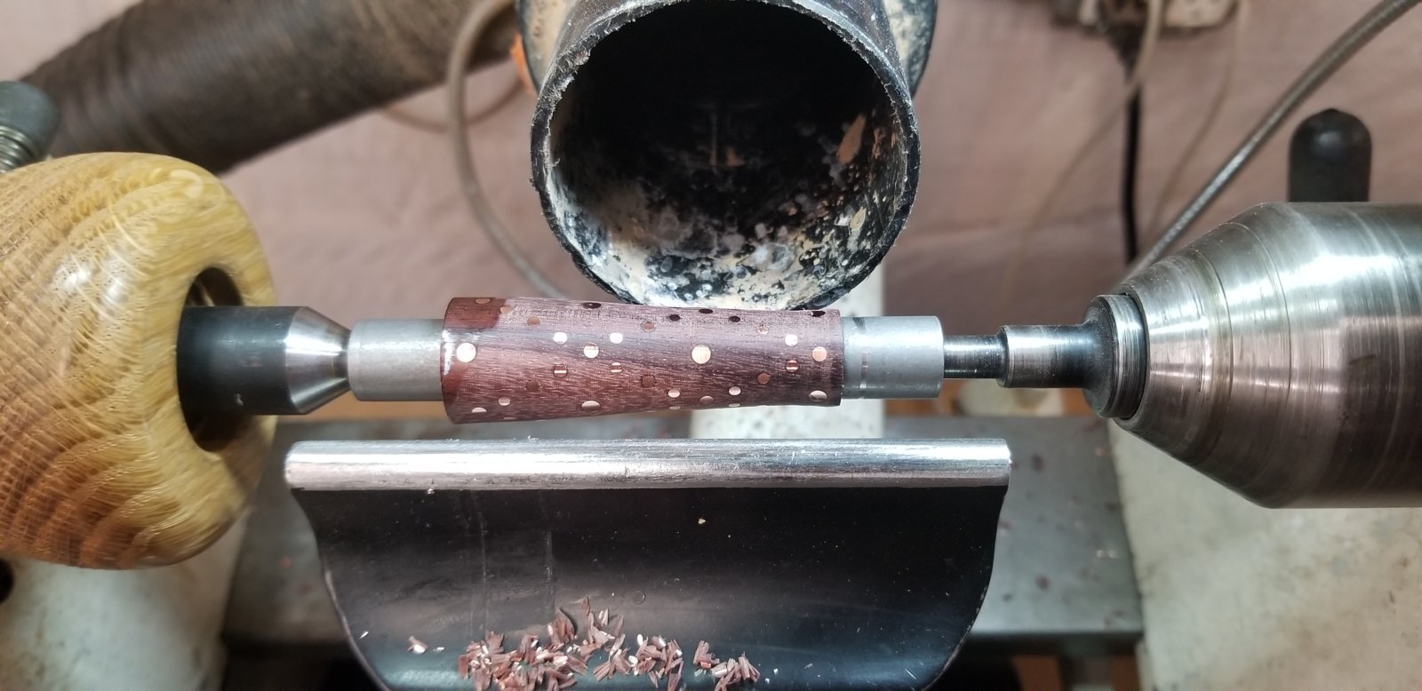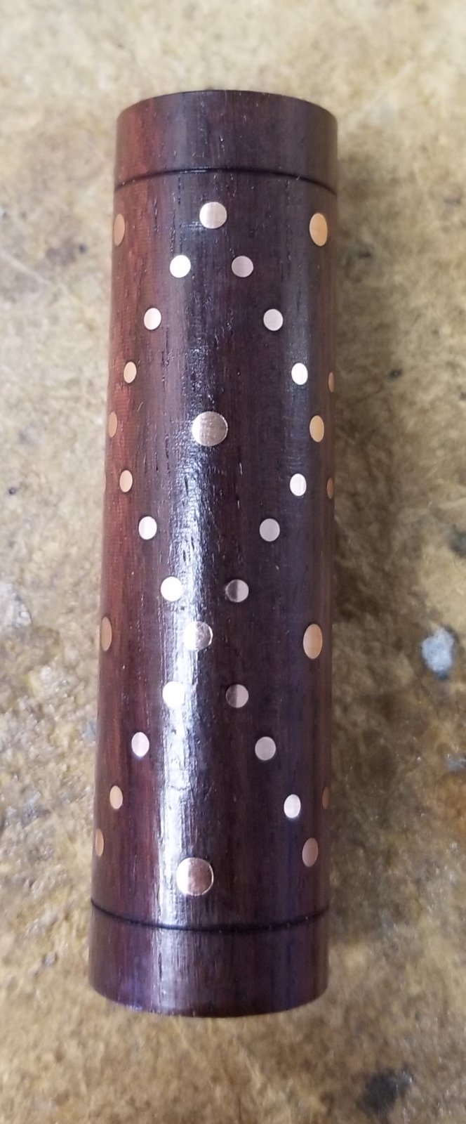 This one I am calling the Electricians pen as it is made using 10 gage, 12 gage, and 14 gage electrical wire. The wood in this blank is katalox and the kit is a copper Elegant Sierra. As you can see from the photos it this is the second try the first try there was a catch. Unfortunately the catch was completely my fault taking to big of a cut of which means I have no one to blame but myself