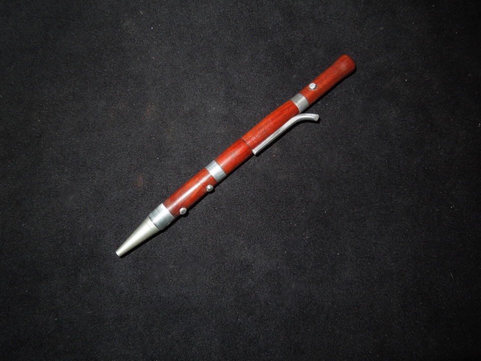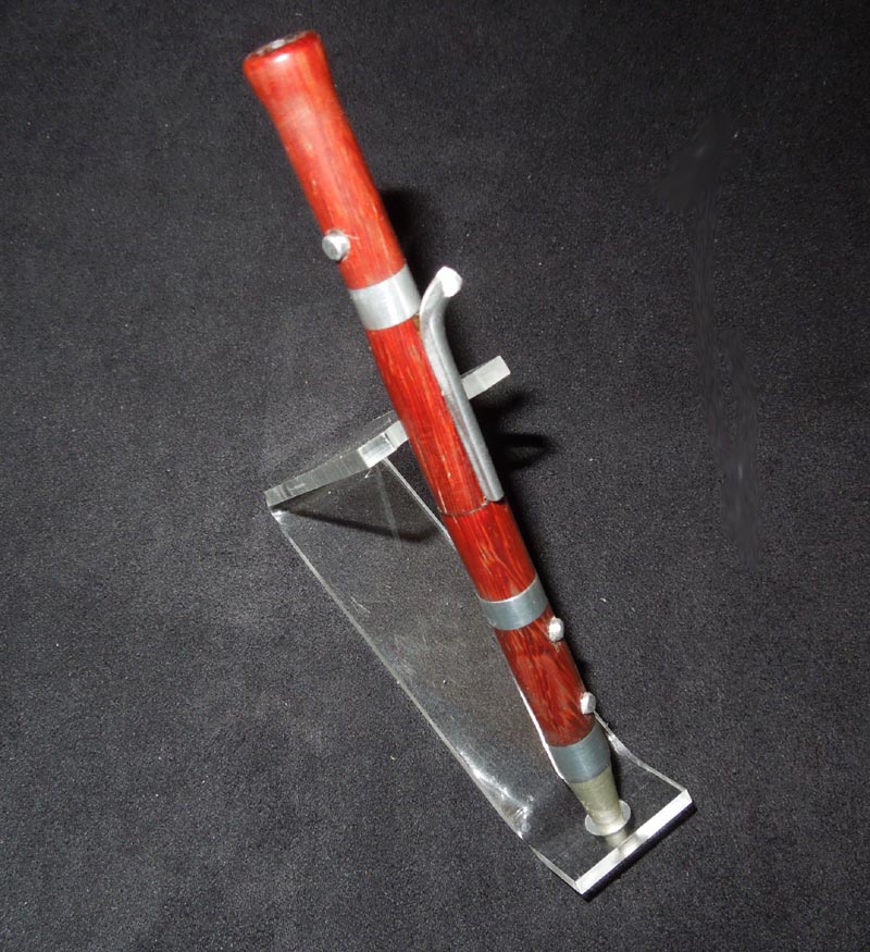 This is the result. Made it out of bloodwood, which I think was a good choice. Used a 7mm transmission. The bands are thick-wall 3/8" AL tubing. The blowie thingie and the three buttons are from solid 1/8" AL rod.