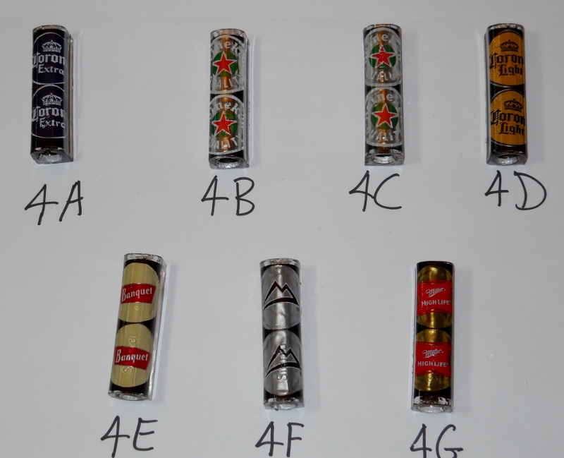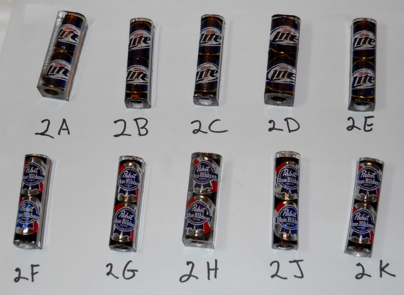 I need to clear out some of my extra blanks. Beer caps are flattened, the corrugated edges trimmed off, bent to fit snugly around painted brass pen tubes, then cast in Polyester Resin.