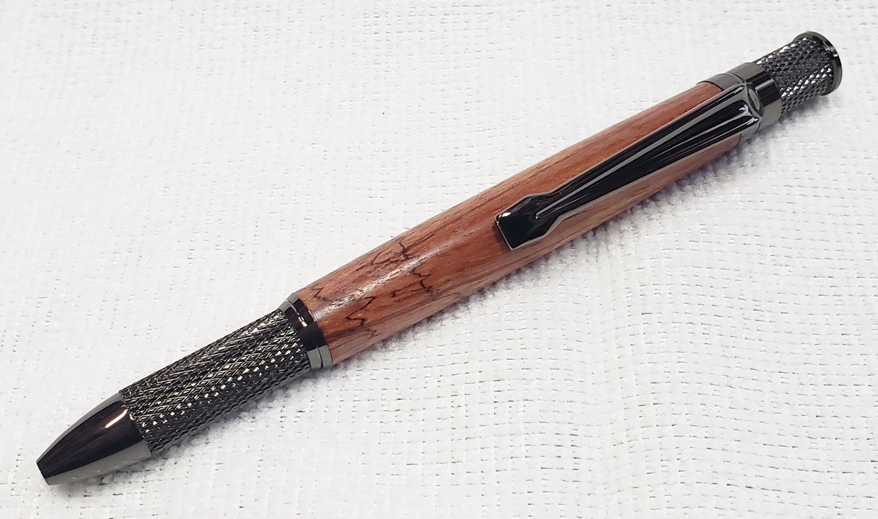 I also keep extra pens for guests, filling out forms, etc.: A Duraclick EDC (Brass) in a windfall downed Brazilian pepper tree branch, and a Gatsby twist (Gold Titanium Nitride) in Holographic Black (inlace acrylester). Both have whatever ballpoint refills they came with, or replaced with Schmidt EasyFlow 9000 medium (for myself) when they run out.