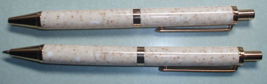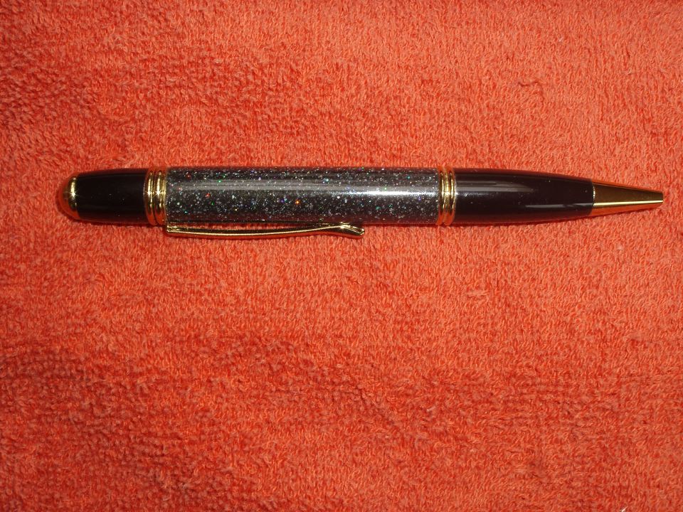 I keep a Slimline Pro pen and pencil set (Gold) in Kryptonite Glow Stonez at my desk. I bought the pen kit at Rockler and ordered the matching pencil kit from Penn State. The pen kit came with a gel refill, and I refill it with a Parker Quink Gel medium black refill. I like the way that gel pens flow onto the paper for writing handwritten letters, notes, and greeting cards.