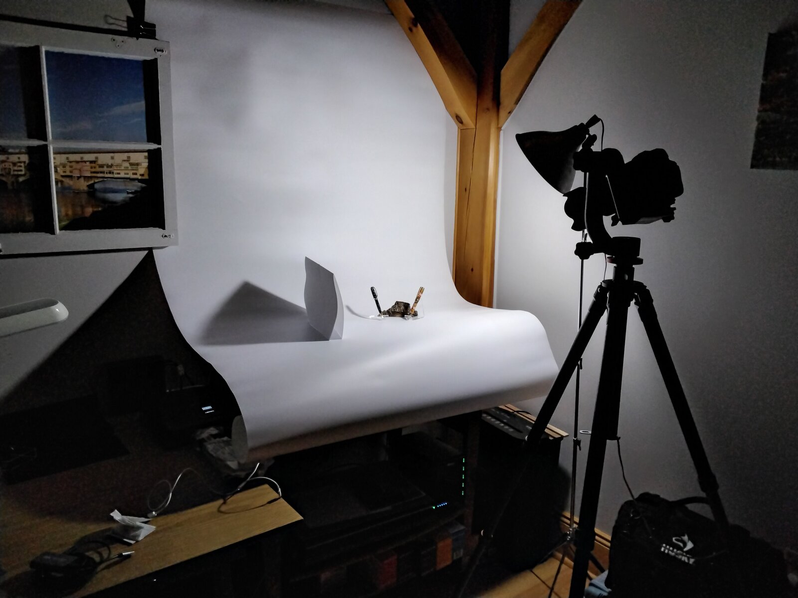 Here is my setup. I wanted something I could use to photograph all my turnings including bowls, hollow forms, boxes, and pens. I bought a large white background that I leave hanging and roll the bottom out of the way when not in use. In use, I roll it out on top of my printer, and I am good to go. I prefer to shoot in the late evening so I can control the light. I use a 5000K led flood lamp and add white paper or card stock as needed to reflect the light. I also shoot with a Canon R5, and post process with Lightroom. I usually add a graduated filter in post to yield a dark background at the top of the photo that fades to white at the bottom. I've attached an example.