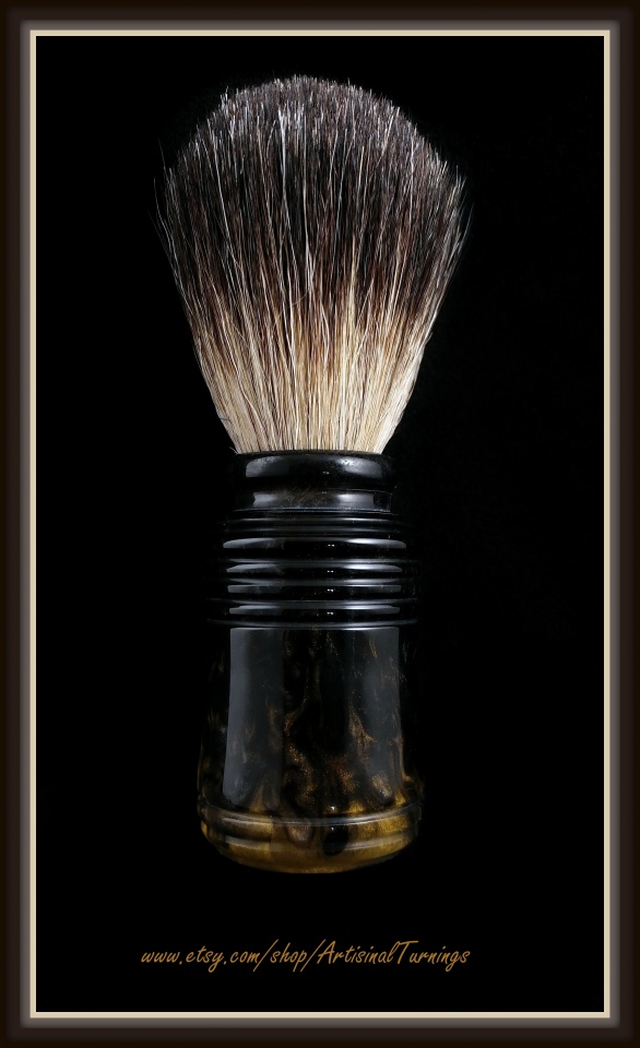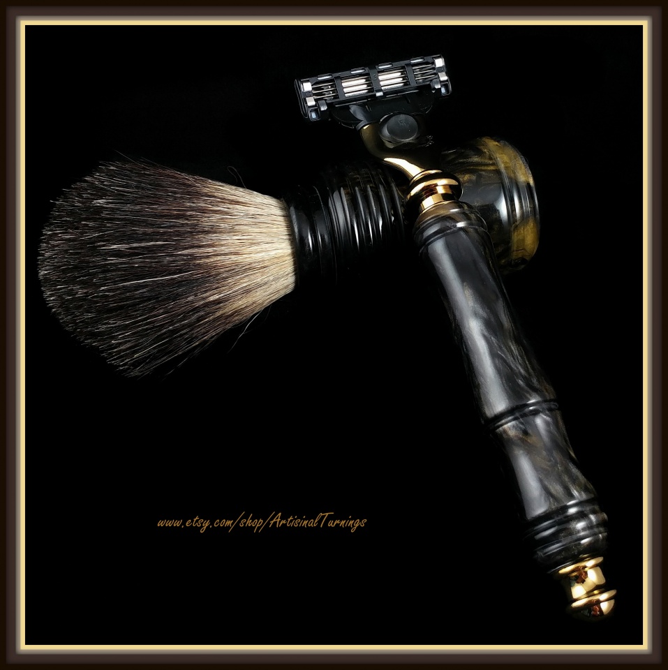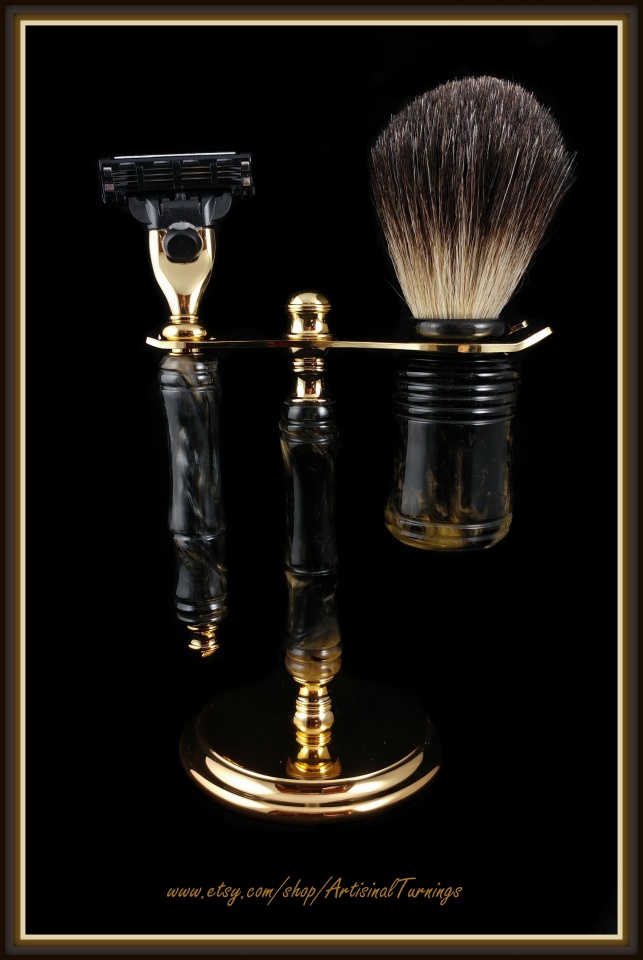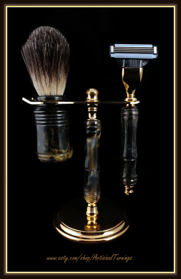 I cast the Black/Gold/Silver swirl blanks for this Mach 3 razor set and I like how it complements the gold razor and stand.