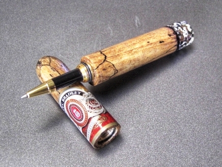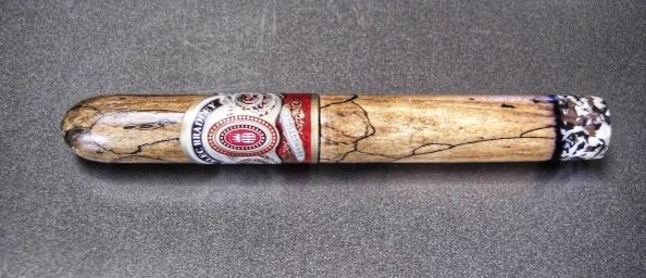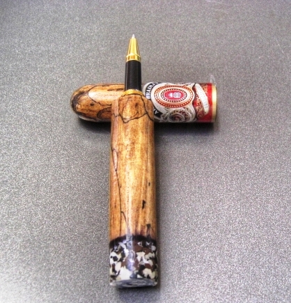 It's been awhile since I have done anything, I kinda lost interest since my Buddy John passed away. Any way I was commissioned to make this for a Young man who loves Cigars, whose birthday is in July. The kit I used is a Big Ben Roller Ball that I got from Ed at exotic blanks. The wood is unknown, it was given to me and was kinda of punky and had to be stabilized. I chose it because of the spalting. The ash is made from epoxy chips from Home-depot cast in Alumilite. The band has been clear coated with Krylon crystal clear and attached with CA. The finish is CA, but I just applied it and did not sand and polish because I was trying to give it some texture.