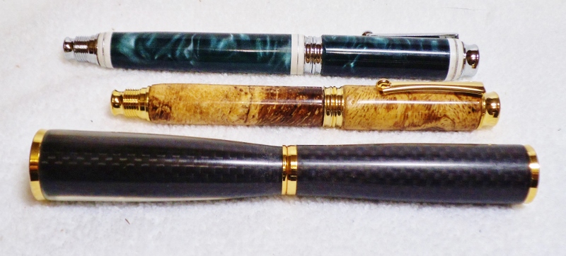 A few weeks ago I had the wife of one of our local football players ask if I could make several pens that would fit her husband's hand when he was signing autographs or indorsments without looking like a childs pen. He stands 6' 6' weighs 250 lbs. and can palm a basketball. These were two pens I made for her. First one is a Gold Spirit from Rockler. I used the tubes from a Jr Gent and the fittings from the Spirit to give me the extre length I wanted. I used black Carbon Fiber blanks from CSUSA full length with no trimming. Sanded and polished with Plastic Polish. Second pen is a Metro Rollerball in chrome from Woodcraft. The tubes are from a Rockler Spirit kit and the fittings from the Metro FP. I added Ivory bands with silver rings to the green pearl blanks. This pen measures 7"s closed and 7 1/2"s posted. The third pen, a normal sized Metro, in gold and oak burl gives you the idea of the size difference. Bigger boys need bigger toys !! Jim S