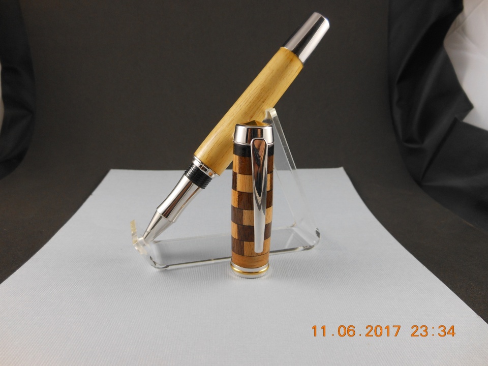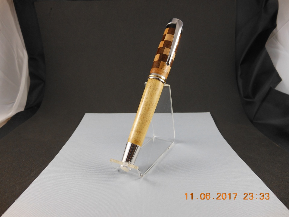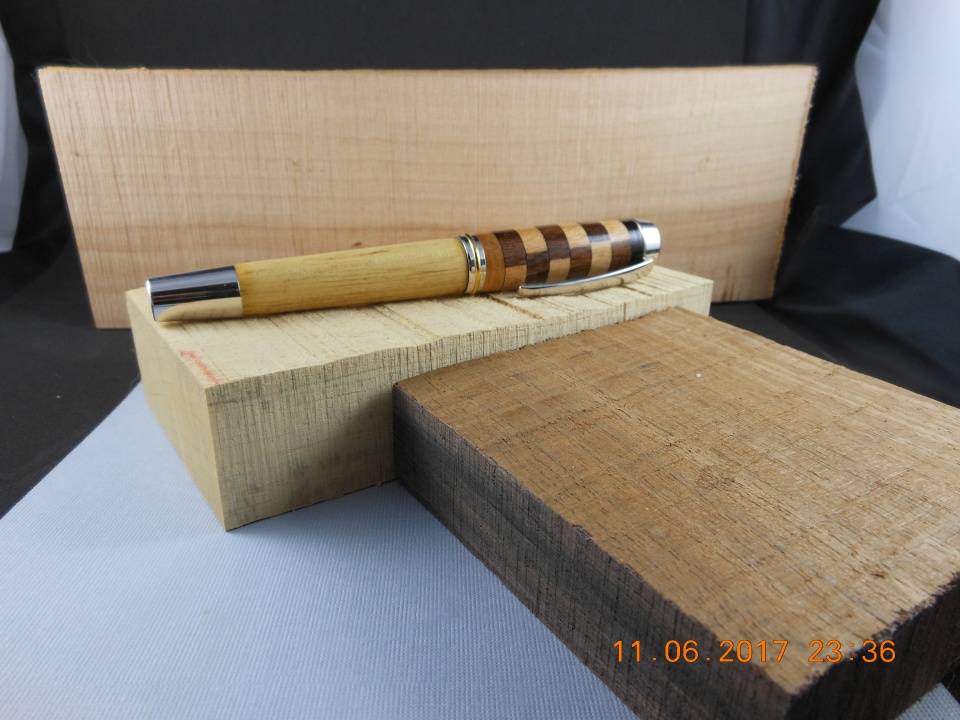 I made a full size gent that i had for quite some time. Tricky drilling these large capped pens. They are nice though. The wood is Beech, walnut, ebony and the barrel is some kind of African yellow wood of which i can't recall the name of, hard as a rock though,heavy and brittle. Thanks for looking. carl
