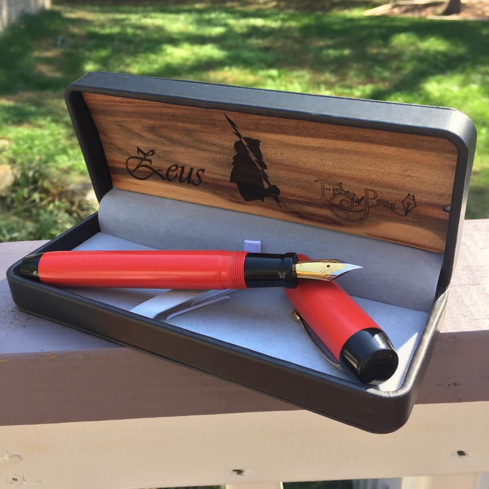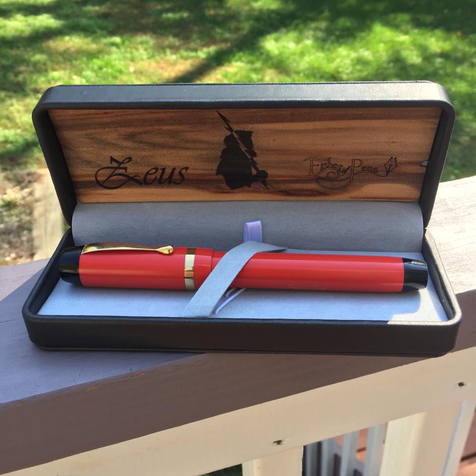 Alumilite body with black ebonite finials and grip. The clip and band were brush plated with 24k gold. The clip was originally nickel and the band was turned from brass. All of the engraving and the box insert were also done in-house.
