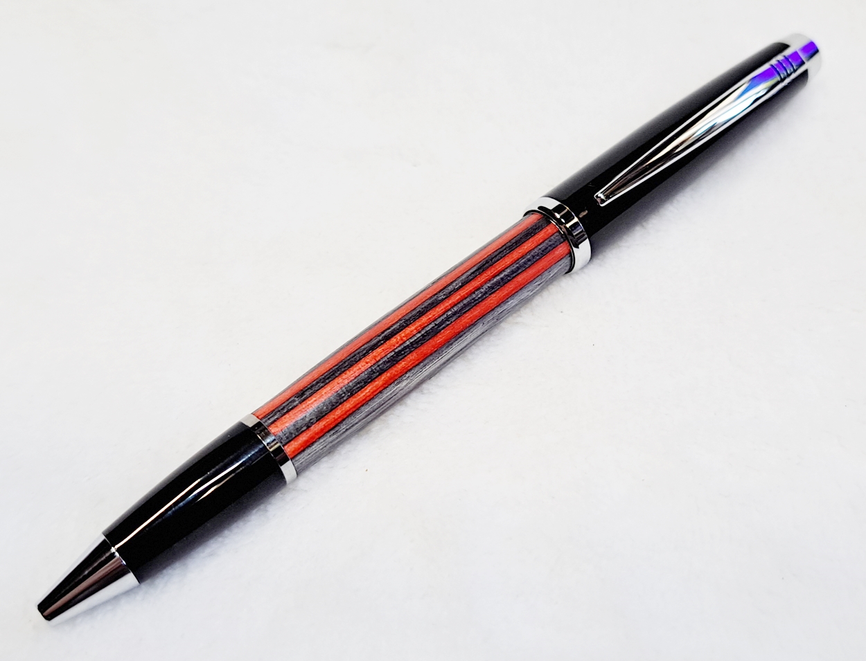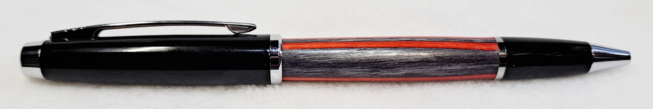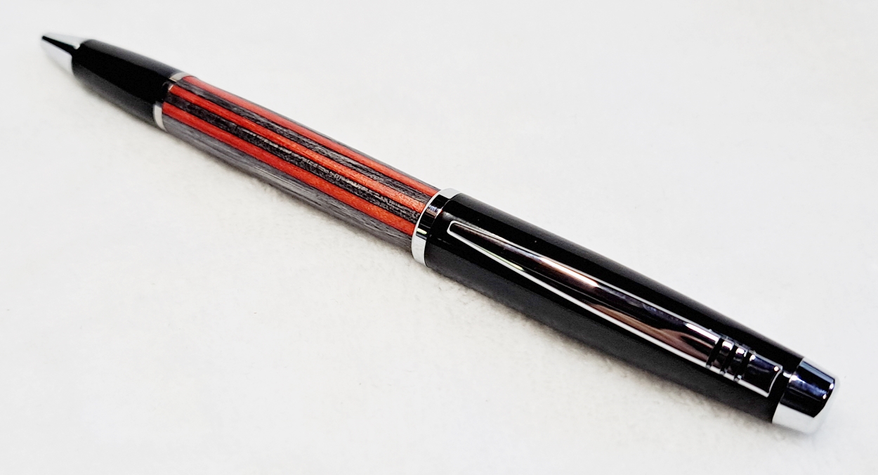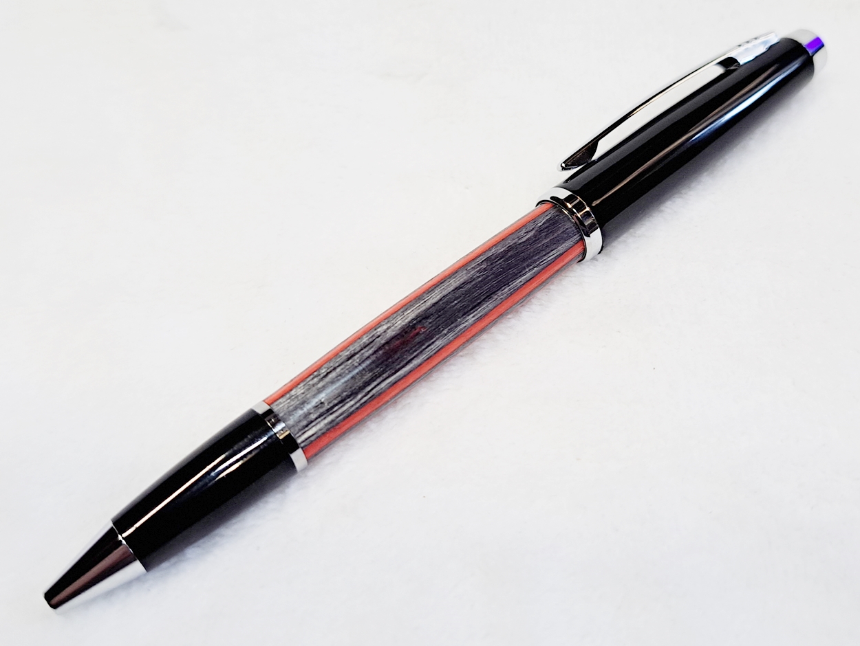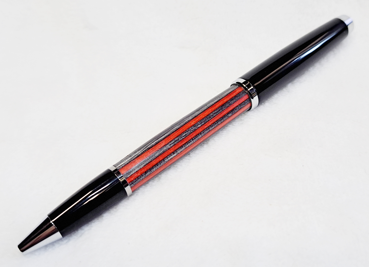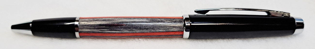 This is a Big Wig twist pen in black chrome and chrome from Woodcraft. It's the Geta pen from Berea. The blank is a SpectraPly called Applejack, also from Woodcraft. The finish is Mylands friction polish and carnuba wax.