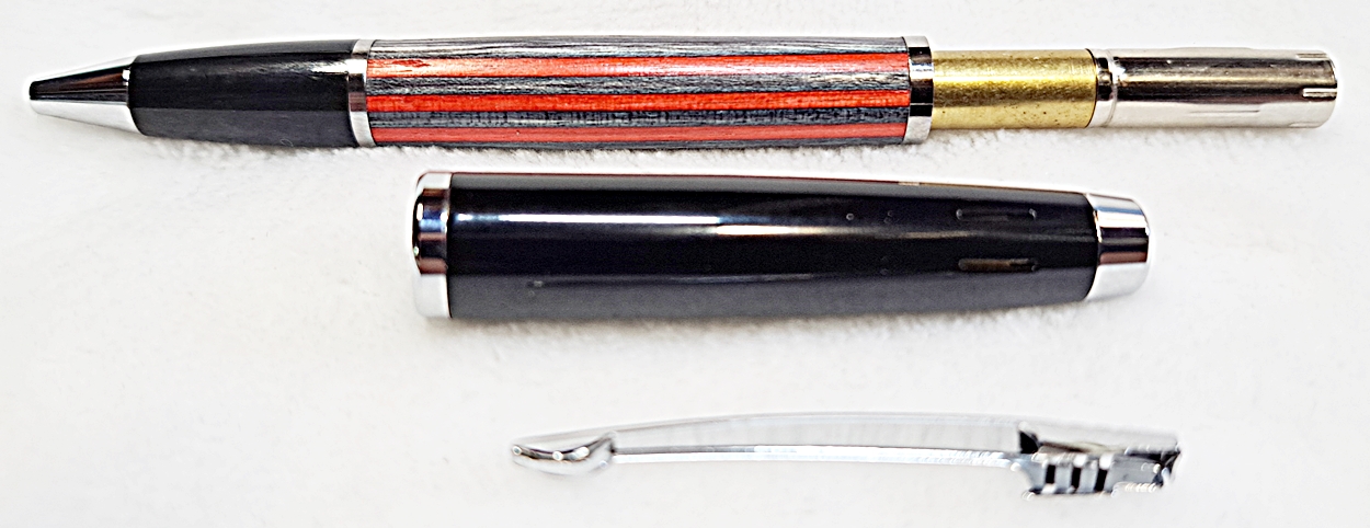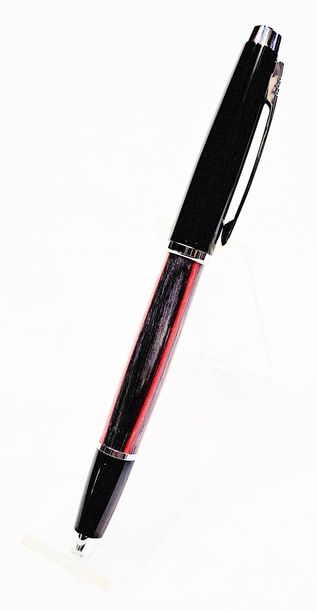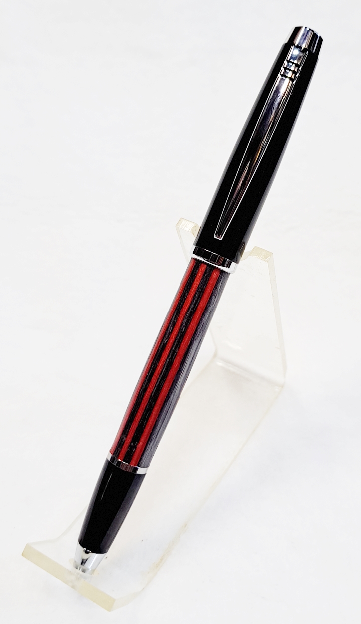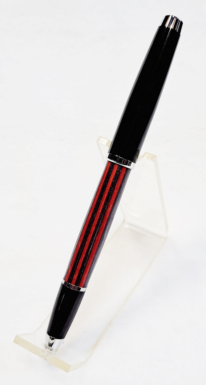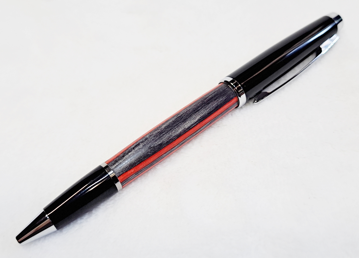 This is a Big Wig twist pen in black chrome and chrome from Woodcraft. It's the Geta pen from Berea. The blank is a SpectraPly called Applejack, also from Woodcraft. The finish is Mylands friction polish and carnuba wax.