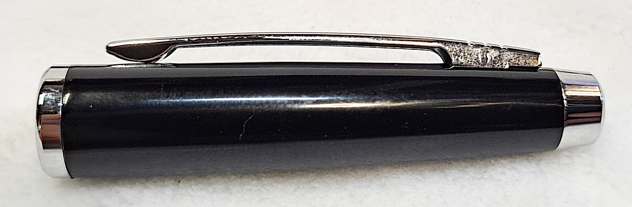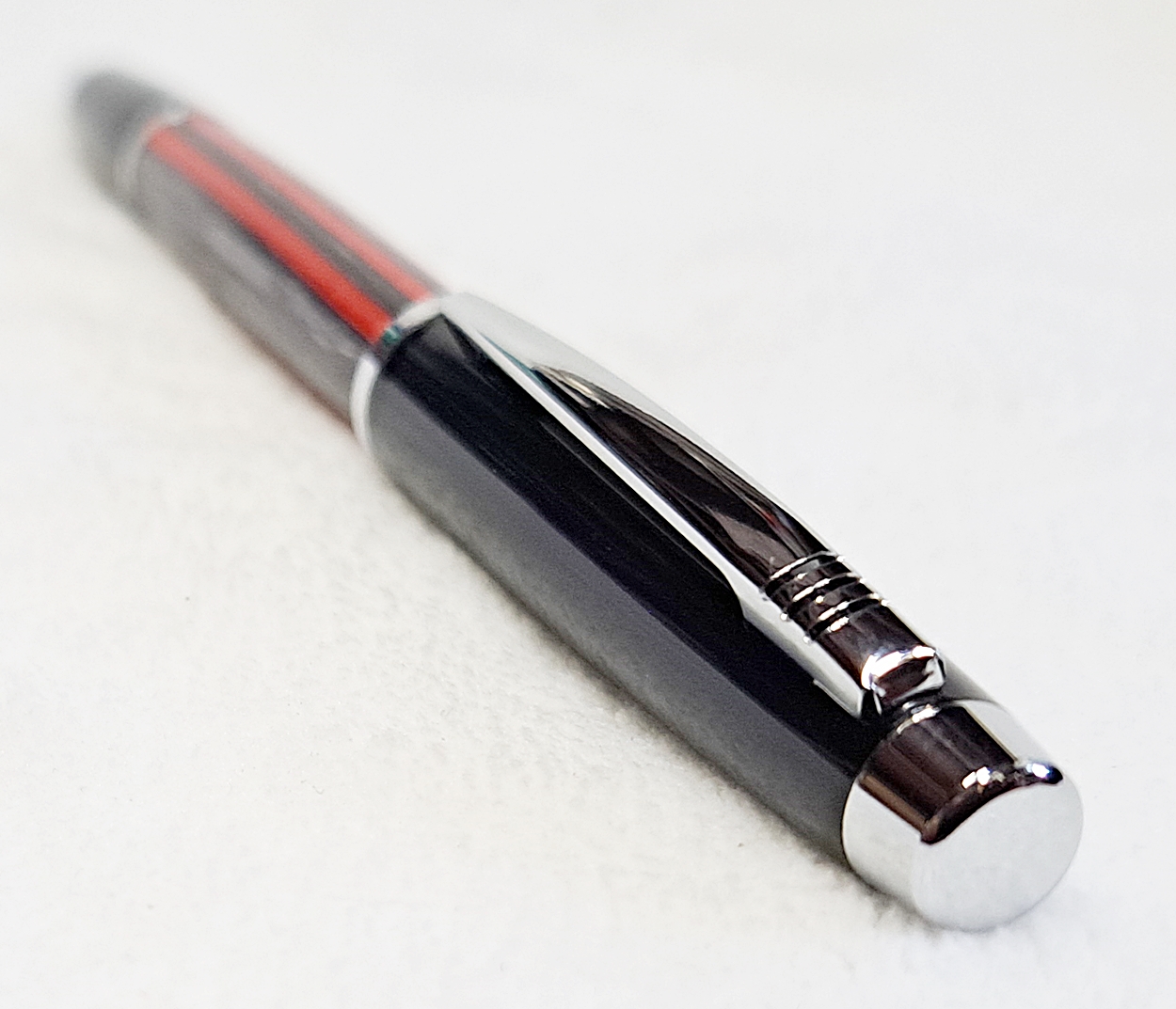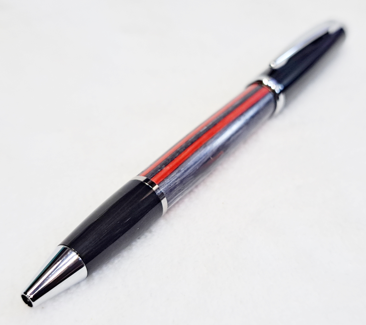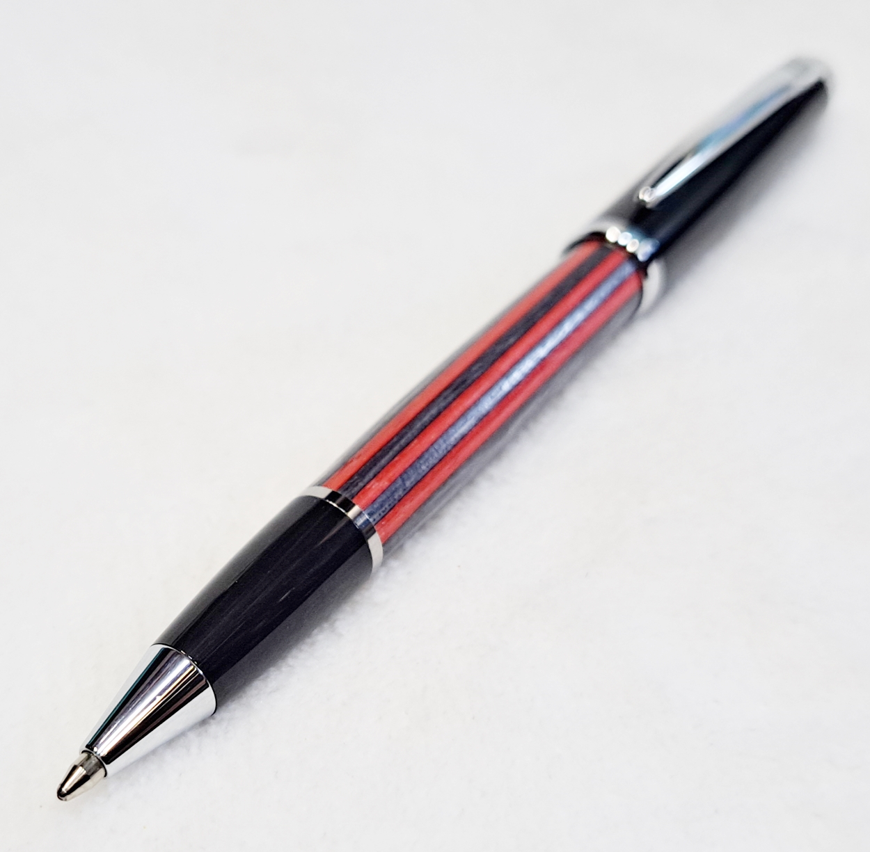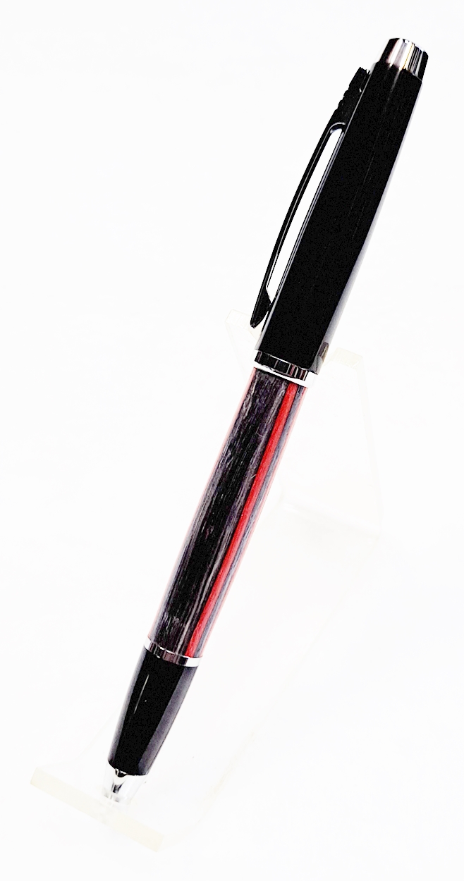This is a Big Wig twist pen in black chrome and chrome from Woodcraft. It's the Geta pen from Berea. The blank is a SpectraPly called Applejack, also from Woodcraft. The finish is Mylands friction polish and carnuba wax.