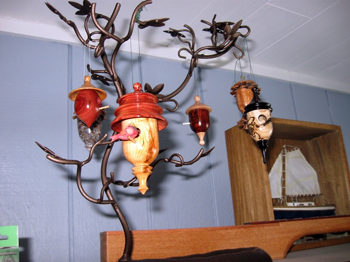 When I started making some bird house ornaments, my wife was pretty excited about them. Last time she came back from Costco she brought this jewelry tree. She thought it would make a nice little display stand for them. Not bad, for $20. It's metal.