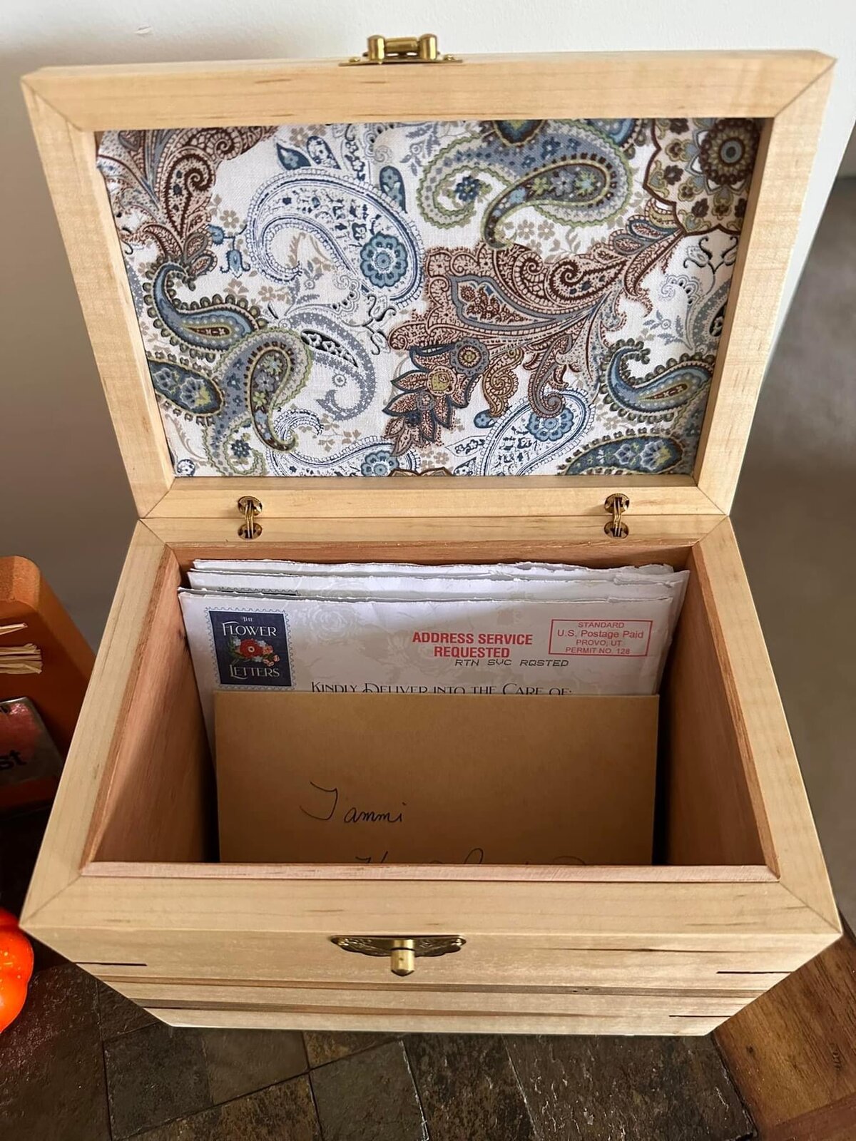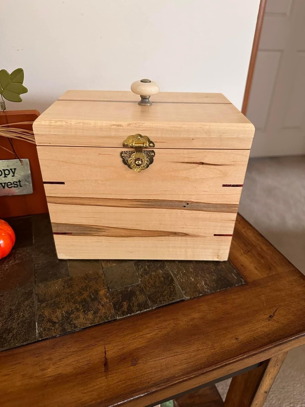 I bought my wife a Flower Letters gift for her birthday. If you have t heard of it, it's basically a book/story told via letters, that you receive in the mail. You get a letter every two weeks for a full year. She absolutely loves it. She asked if I'd also make her a box to keep them in. Here's the result. I used ambrosia maple and added dyed and stabilized maple burl splines. It has a paisley fabric covering on the inside top and bottom. The box is sleeved with 1/8 cherry.