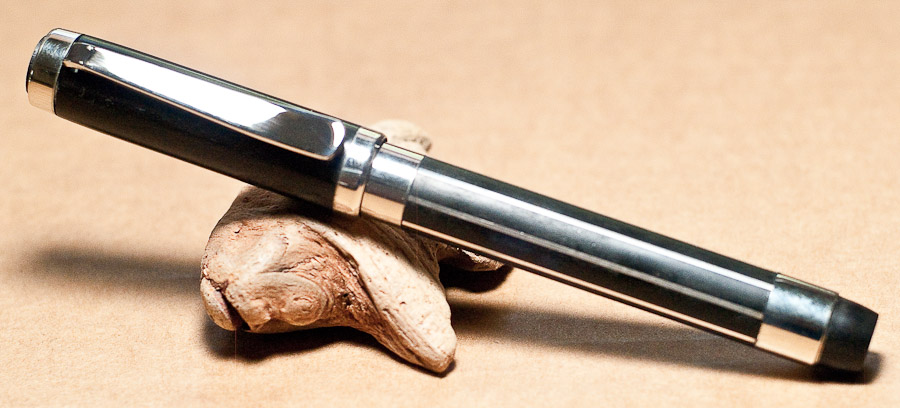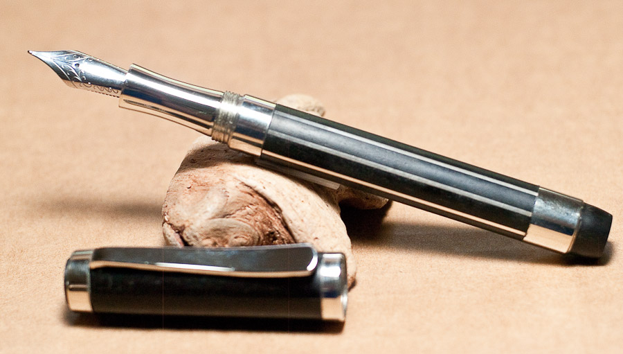 This is Gaboon Ebony -- the blackest of woods -- sparkled up with Sterling silver stripes and nickel silver trim. Feels pretty good in the hand -- substantial without feeling like you're overloaded.
