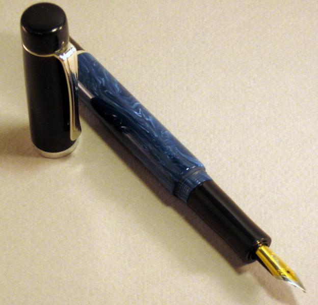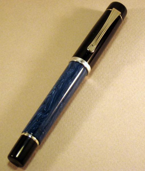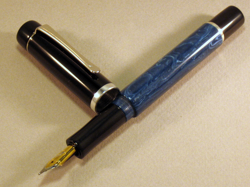 The black parts are alumilite from Johnathon Brooks (brooks803) I've had the blue blank so long I can't remember what it's made of. The nib is a #5 Heritance from Roy at Classicnibs.com I used a Sterling Silver band on the lower barrel finial. The band on the cap is aluminum insert with triple start threads. I'm working on making those from silver ....someday