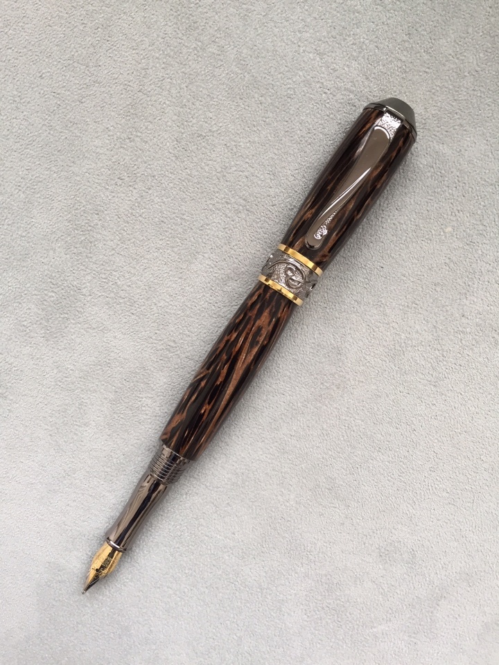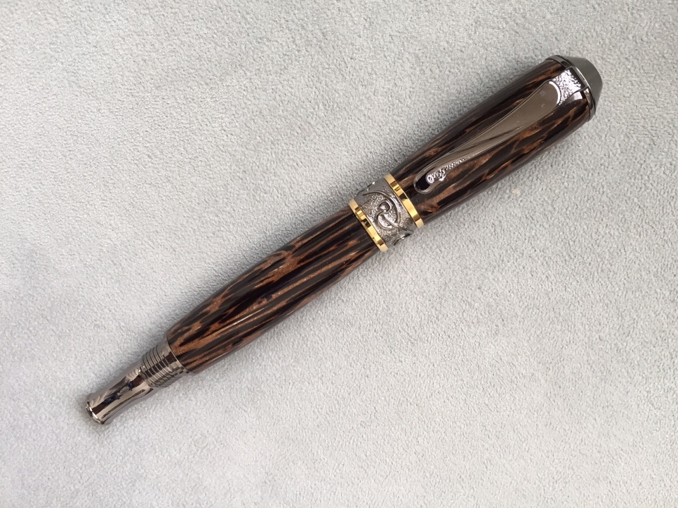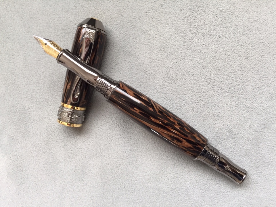 This is my first pen using Black Palm. It has always given me trouble splitting when making thin knife handles. This time I stabilized it with Cactus Juice and turned away. There were few small tear outs I filled with dust and tinted CA. I was impressed with the Broadwell Nouveau Sceptre pen kit. The finish on the components was superb. The Black Titanium and Gold goes well with the Black Palm. The JOWO Broad nib needed some minor alignment only and writes extremely smooth with bold clean lines.