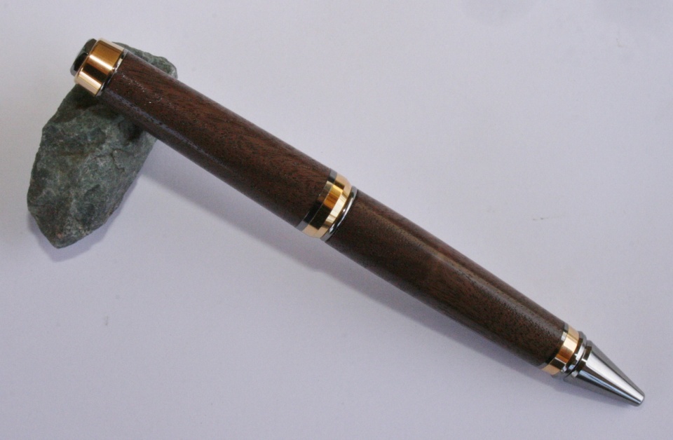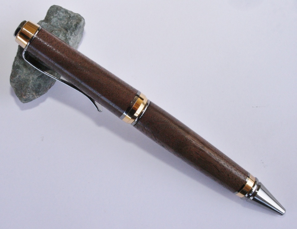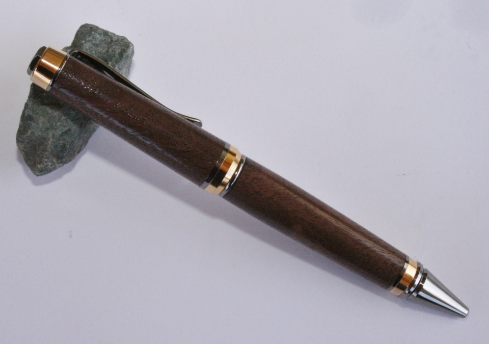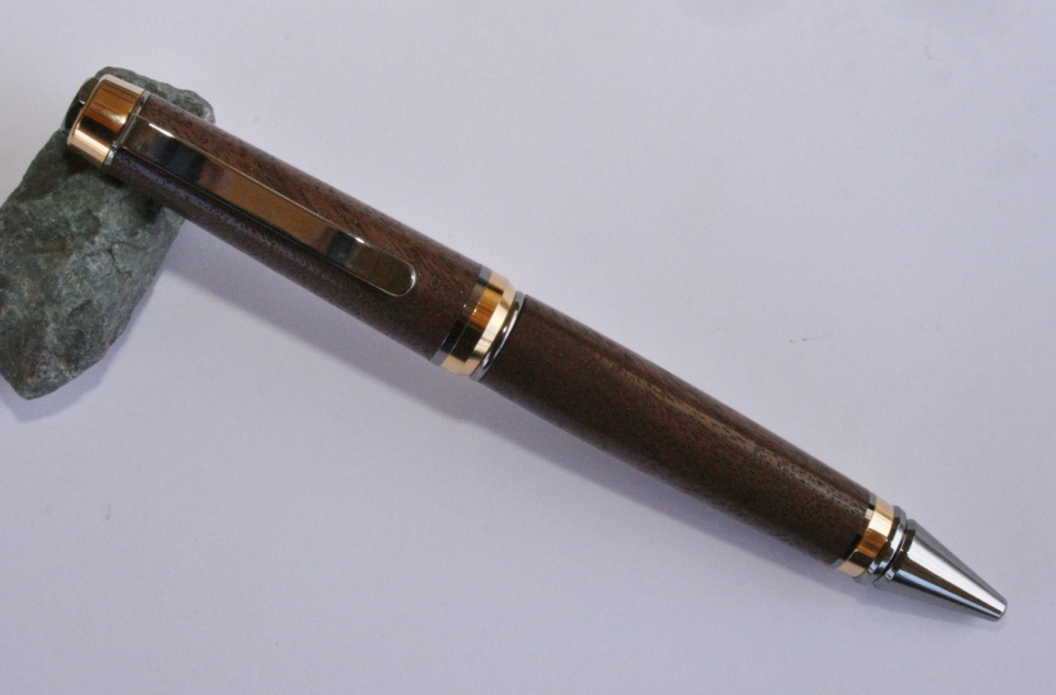 My local Woodcraft had some small pieces of figured walnut. I thought it might some nice pen so I picked up a piece. I paired it with a Black Titanium with Gold Titanium accents. After I had the blanks finished I ask Evelyn what kit she though would look best and she picked the same kit. I sanded the blank to 12000 mm and finished with WTF. All C & C are welcome.