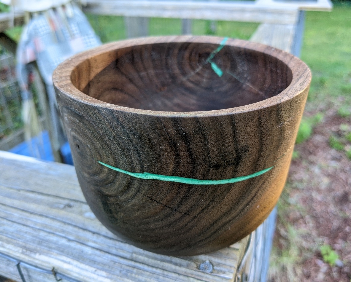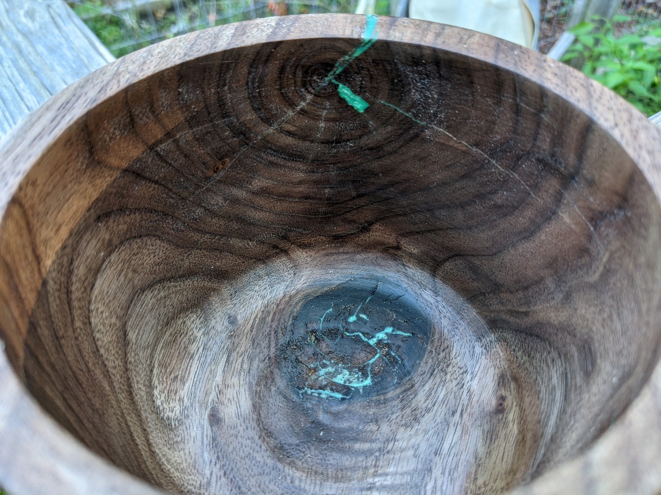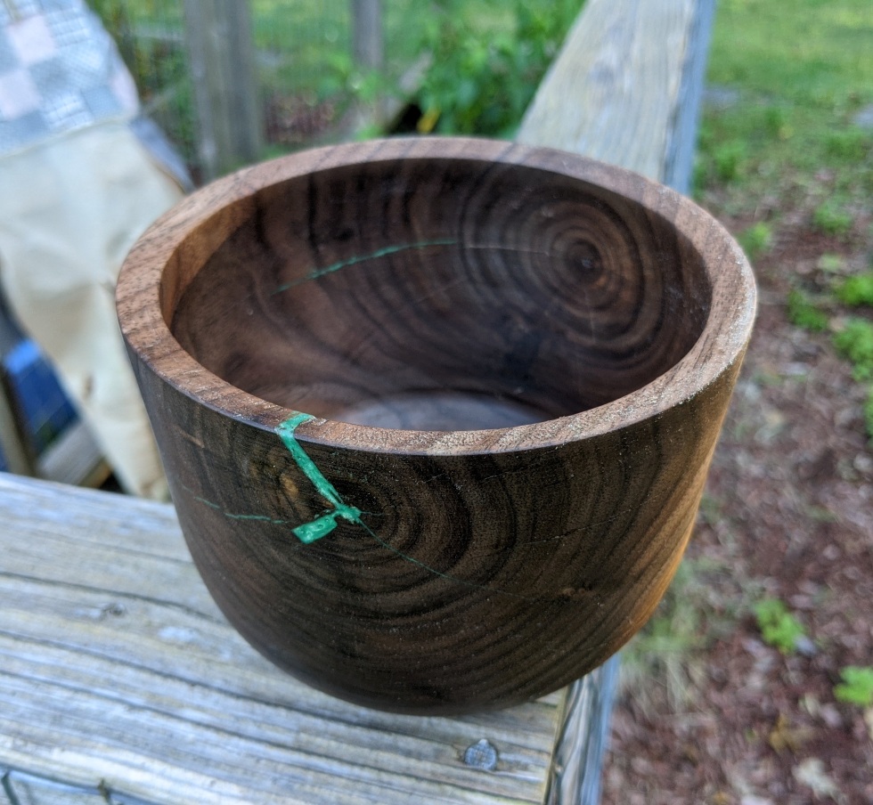 This is a taller bowl from the Black Walnut I was gifted by a neighbor. The logs are drying out quickly (Yeah, I know, I shoulda treated the ends) and developed cracks so I had to get kinda creative. I sorta rushed this one and the finish isnt as nice as I'd like it. Used Tried and True Original food safe finish.