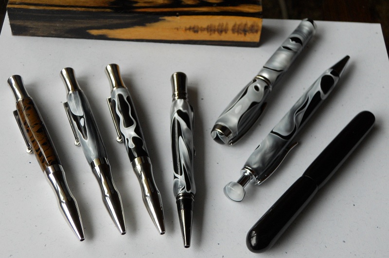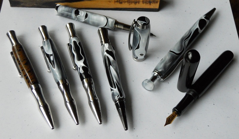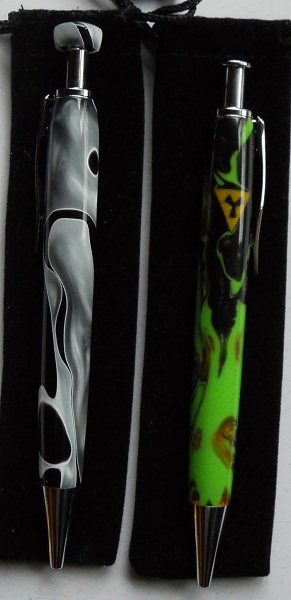 Im loving this black and white acrylic(?) right now. Tubes and blank (reverse) painted black. Done 3 of these Jeff Powell blanks now (MJ, nuclear and unicorn) and they are fantastic! Great to work and look incredible when finished. My pic doesn't come close to doing the nuke clicker justice. Also my first 2 ebonite pens. Brown ripple on the Virage just to see how it drilled and turned, std black ebonite on my first kitless! I kinda stumbled my way thru this one, and its got plenty of issues, but somehow the end product doesnt look too bad.:tongue: You might notice the feed holder sticking out a bit; trashed those threads. Good friction fit tho.