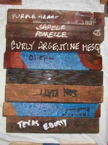 Irish Bog Oak, Ebony, Oliepod, Tasmania,n Blackwood, Texas Ebony, W. Plum, Verdecillo, Flaming Box Elder, Leopard, Wenge, Zireote, Koa, Goncalo Alves, Oklahoma Red Bud, Chechen, Yellow Heart, Carob, Asian Orange Wood, Bocote, Cedar, Longan Berry, Mesquite, Magnolia, Escarpulent Black Cherry, Mahogany, San Kiatt, Victor Olive, Asian Ebony, Sonbveling Rosewood, Black Oak, Marble Wood, Palm, Camphor, Bloodwood, Monkey Pod, Bubinga, Staghorn, Curly Brazilian Redwood, Brazilian Redwood, Zebranbon, Honduran Rosewood, Japeye Mahogany, Masarandube, Holly, Cocobolo, Chestnut, Curly Wenge, Myrtle, 1880s wood from house, American Wormy Chestnut, Bethelham Olive, Russian Olive, Jack Daniels with certs, Curly Argentine Mesq, Partridge Wood, Sapele Pomelle, Beb Green, Purple Heart, Birdseye Maple, Apricot, Curly Maple, Honey Mesquite, Anaqua, Myrtle, White Oak, Desert Ironwood, Catalpa, Afzelia Xlay, Beb Gold, Cypress, Granadiloo, Quilted Wenge, Figured Mesquite and many more without names on them.