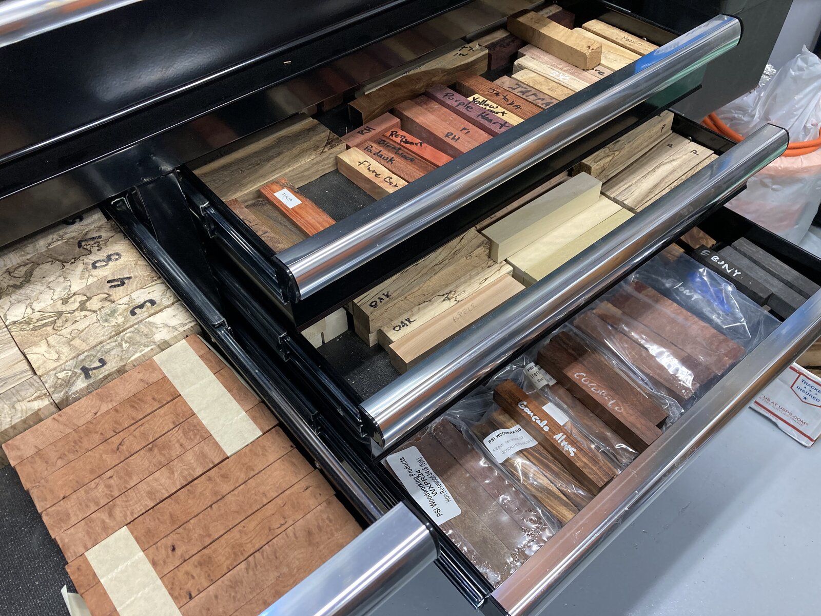 How do you store your wood blanks? I keep them out of direct light, in drawers, to prevent color fading. My small shop is heated and I have a dehumidifier running there set to 40%. The blanks often come wrapped in plastic, and if they're kiln dried, keeping them in plastic is probably the best way to keep them as dry as possible. OR, should I open them up and let them acclimate to my shop? They crack when they dry out, not when they reabsorb humidity from the air, right?