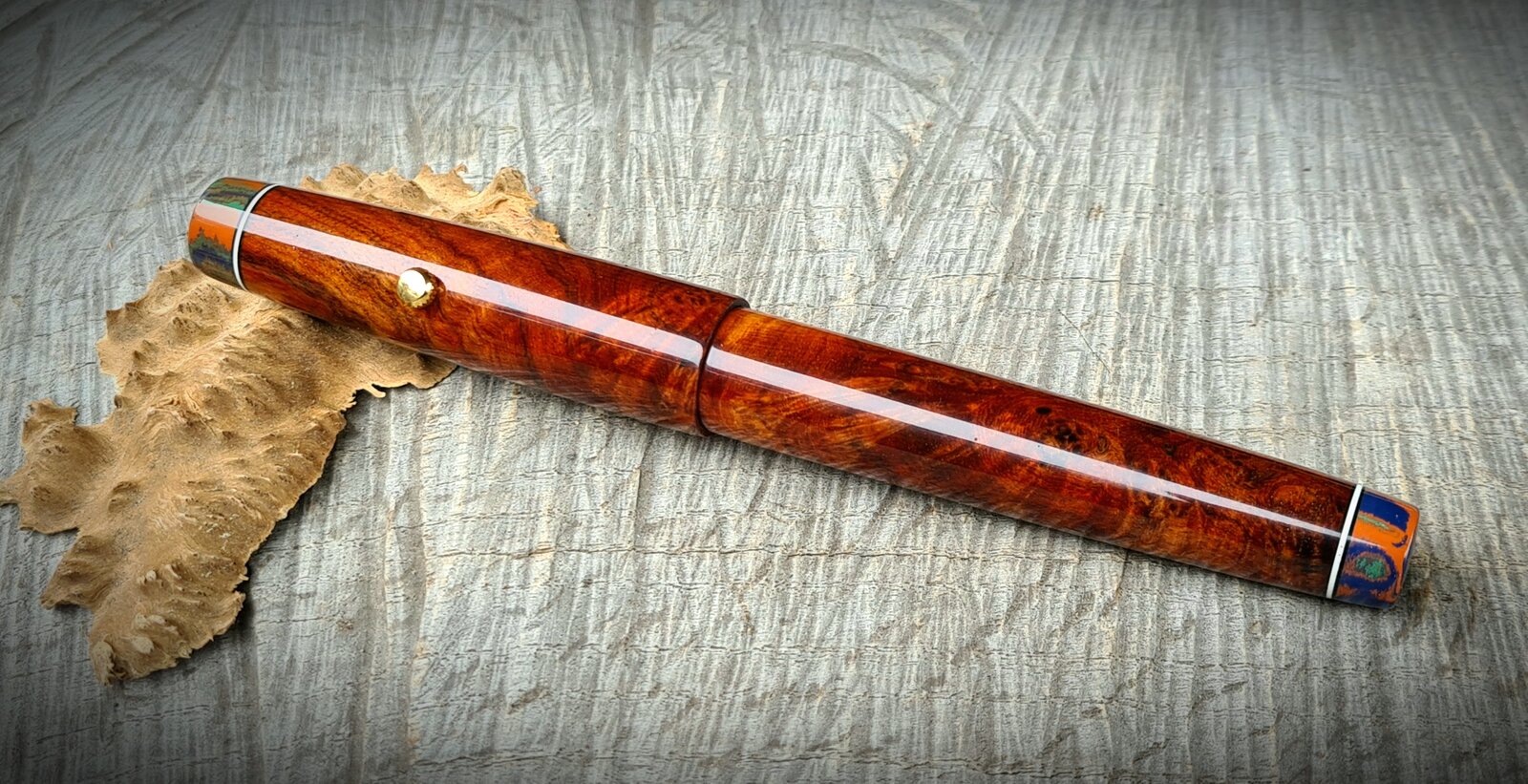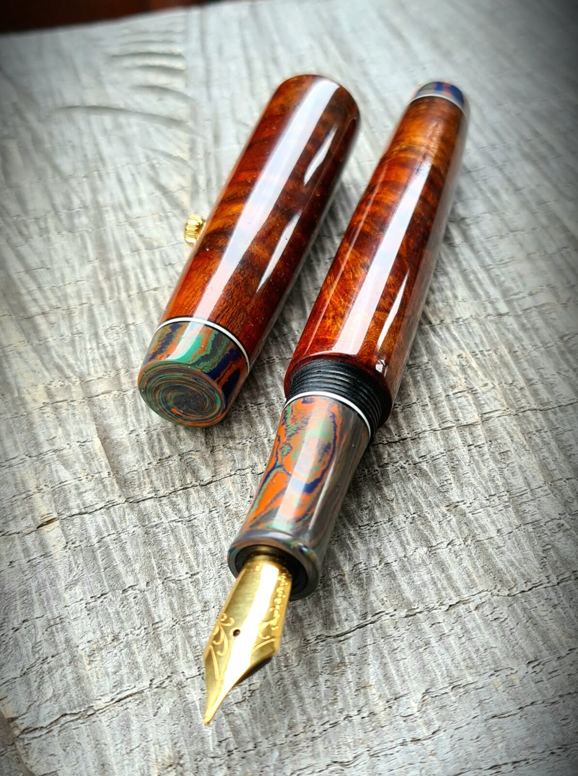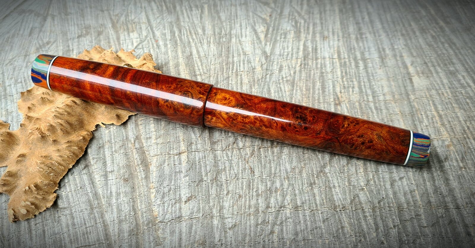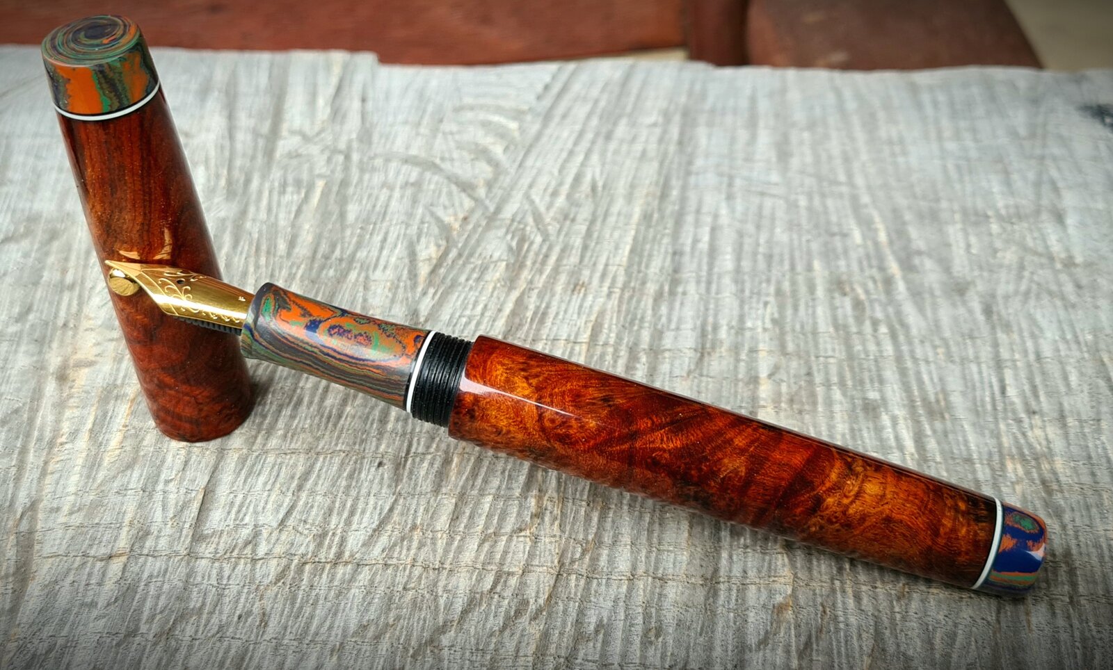 A lovely piece of bloodwood burl sleeved with black ebonite, coloured ebonite finials and section, ca finish, watch crown roll stop, jowo #6 nib.