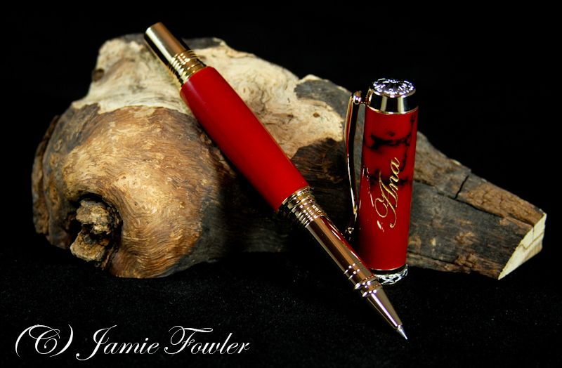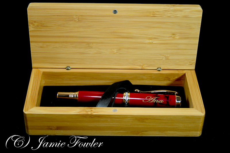 Here is a Bloody Basin Jasper Titan rollerball pen. Laser Engraved her name on the cap and filled with antique gold rub n buff. Also with a custom laser engraved bamboo presentation box that was made special for a customer as a going away gift.