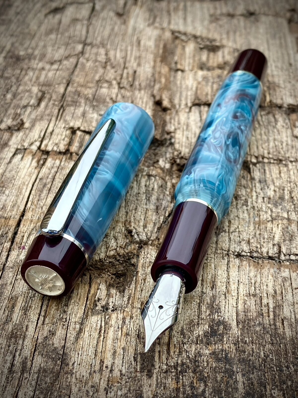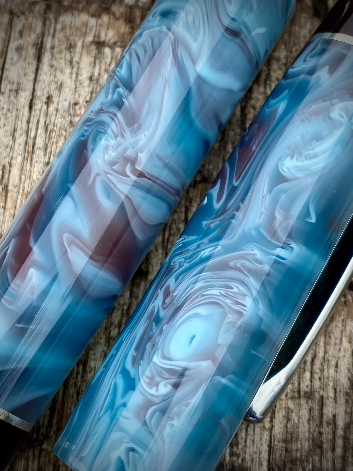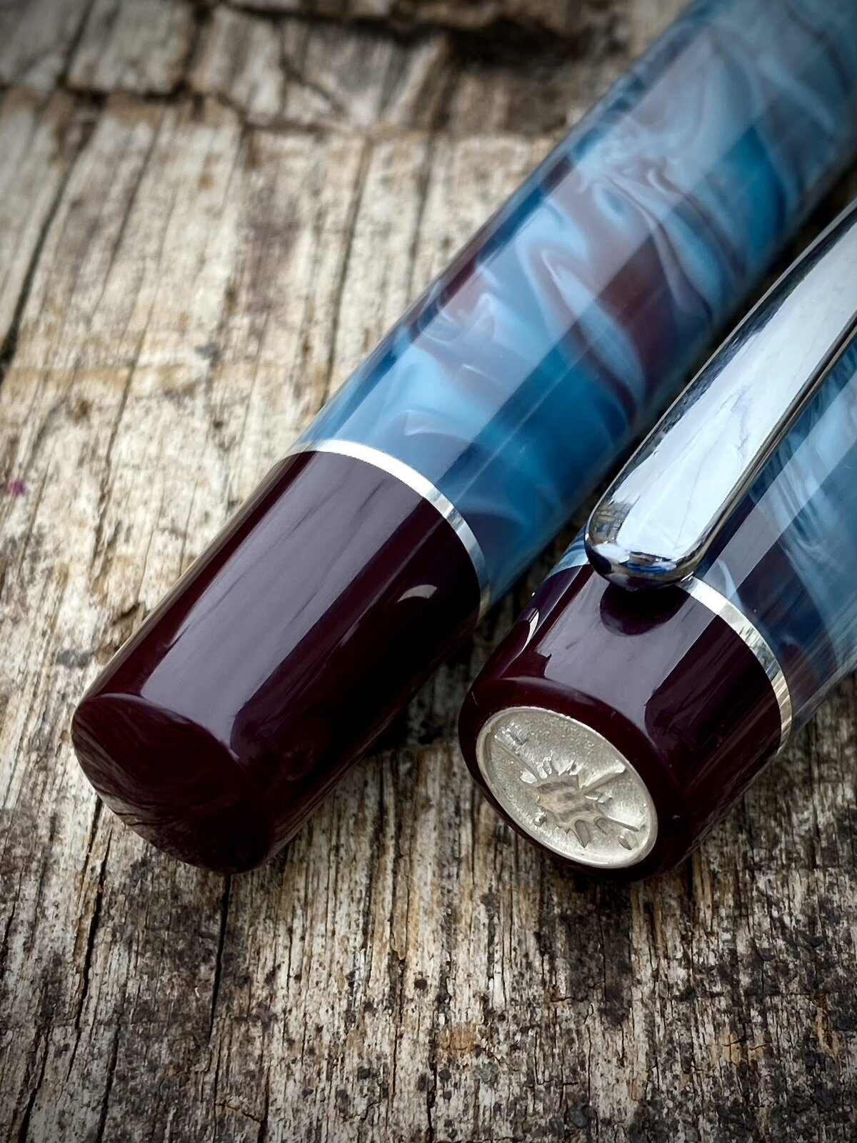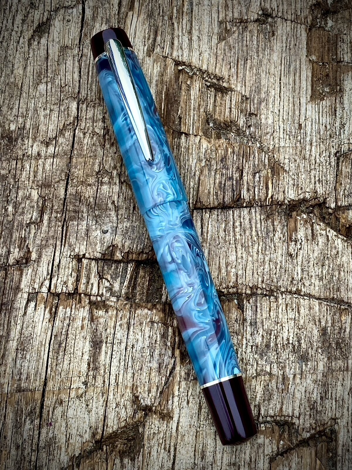 A nice blue and burgundy blank here. It's acrylic and really caught my eye as the colour combination is a little bit different. I've matched it with burgundy acrylic finials.
