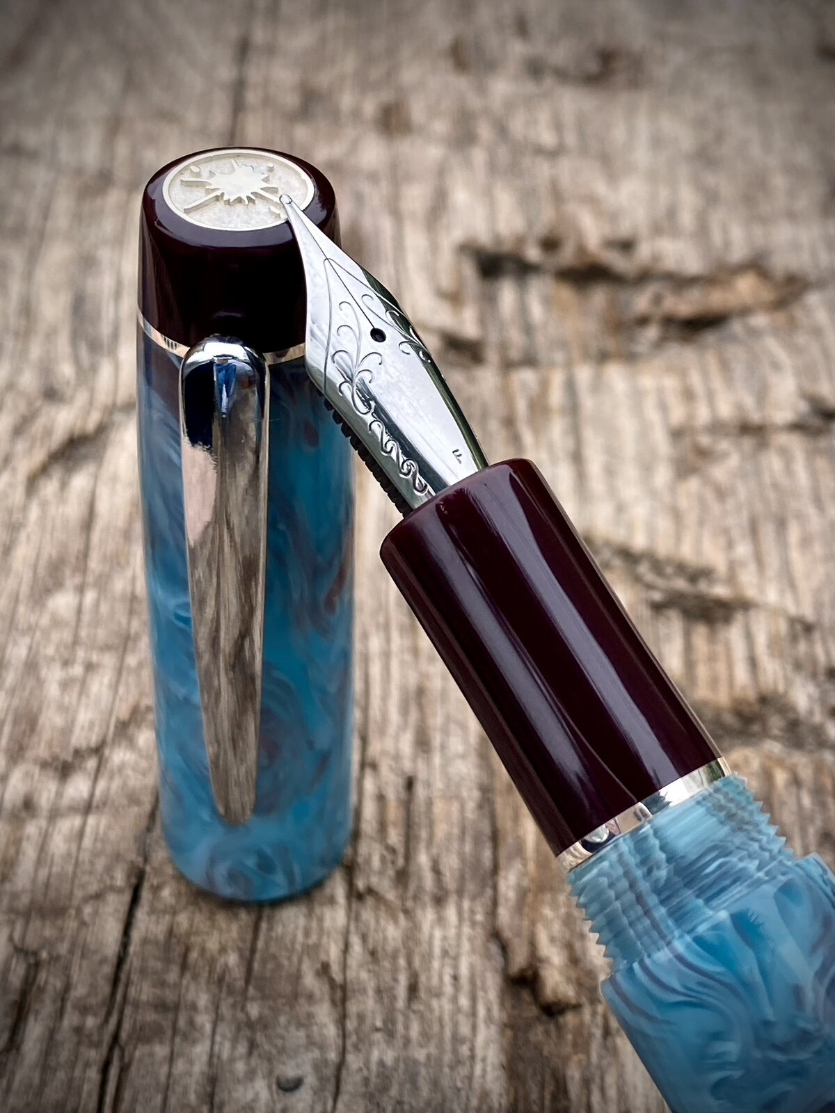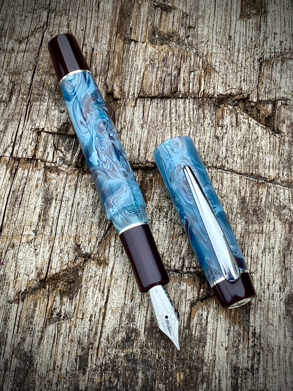 It's has sterling silver accent rings and a chrome plated steel clip (bought). Fitted with a Jowo no6 nib and fed by cartridge converter.