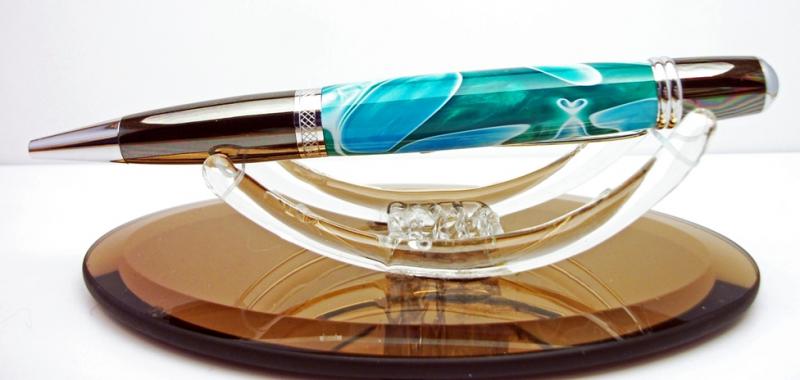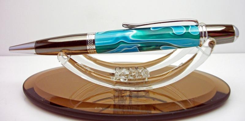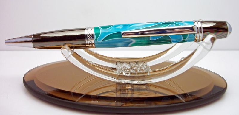 One of my co-workers requested that I make her a sierra with some kind of blue or green blank, So I chose this blue and green blank, it has been sanded to 1500 then MM to 12000 and finished with plastic polish. It is on Black Ti from CSUSA, and inside of the blank was painted white.