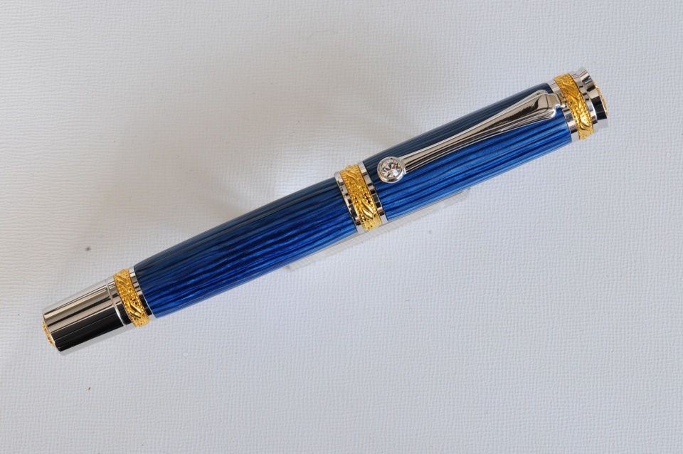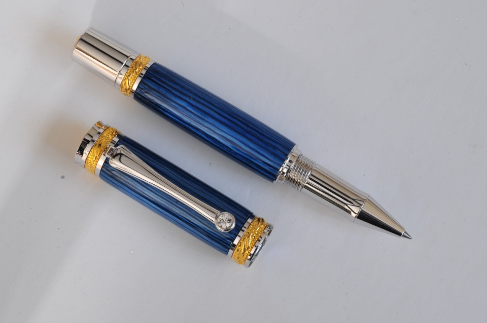 I haven't made many pens lately but this is a beauty. Made of vintage casein, blue striped color on a full size Majestic roller ball. This is one I will add to my collection unless the price is right.